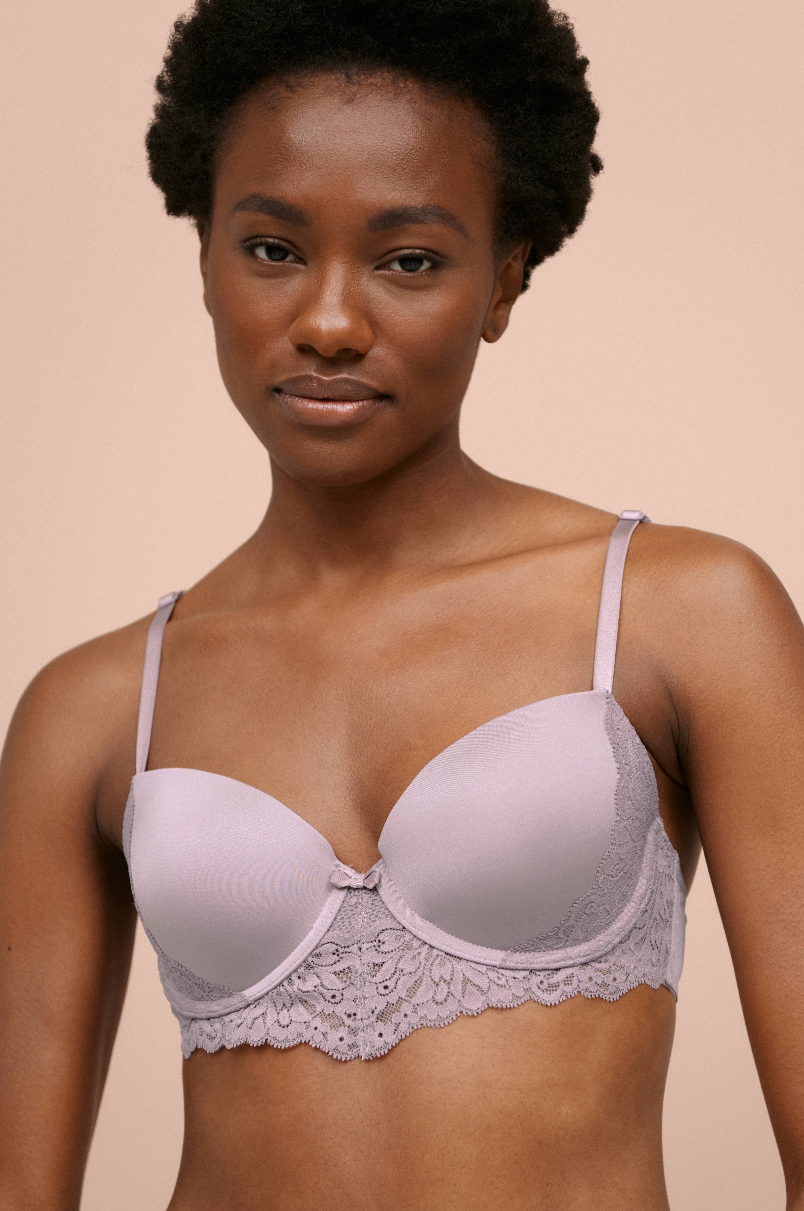 Bøjle-bh med blank, let vatterede skåle med blonde i siderne. Justerbare skulderstropper og hægte-/mallelukning bagpå.