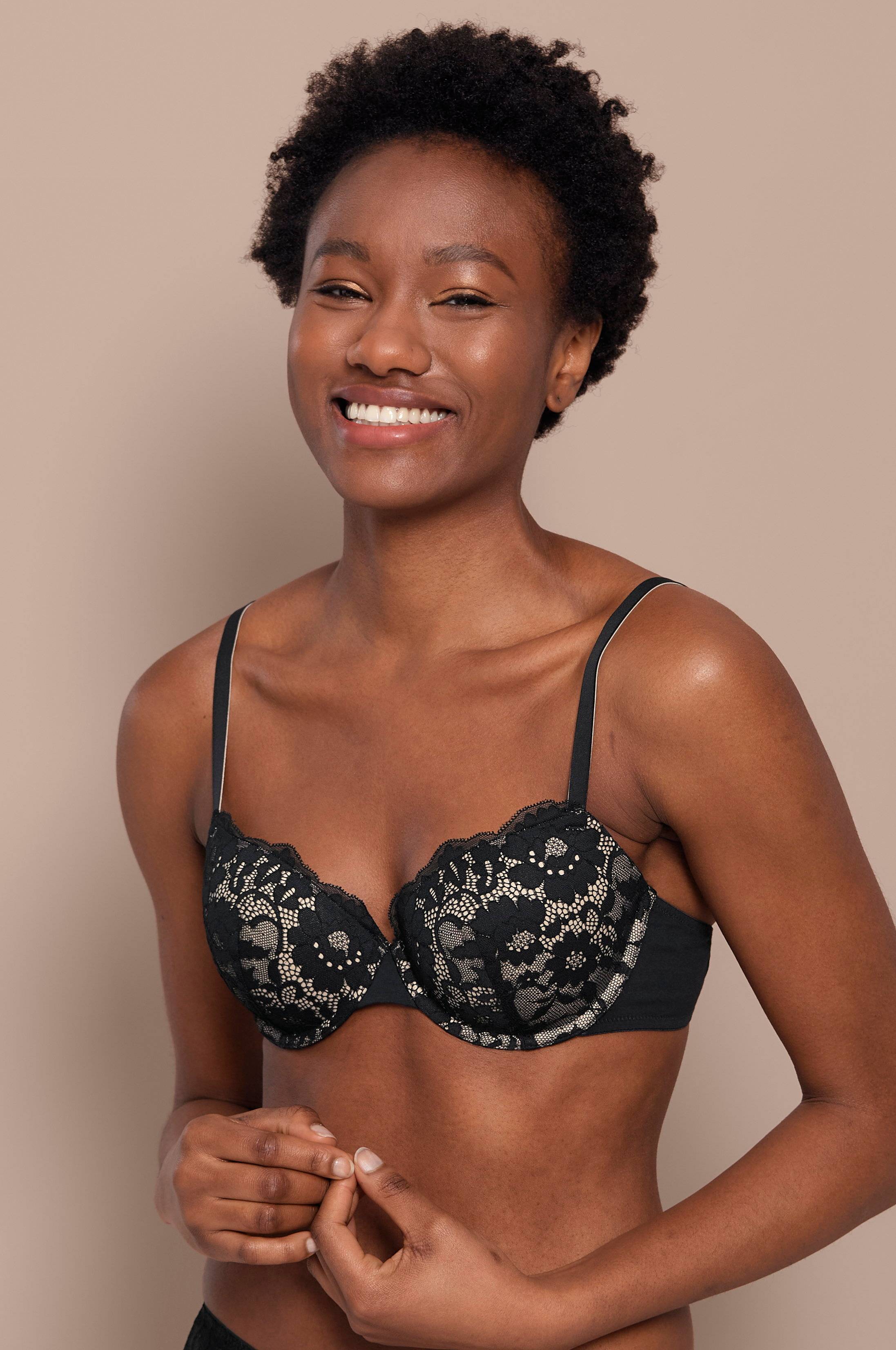 Blonde-bh med bøjle og let vatterede formpressede skåle. Justerbare skulderstropper og hægte- og mallelukning i ryggen.