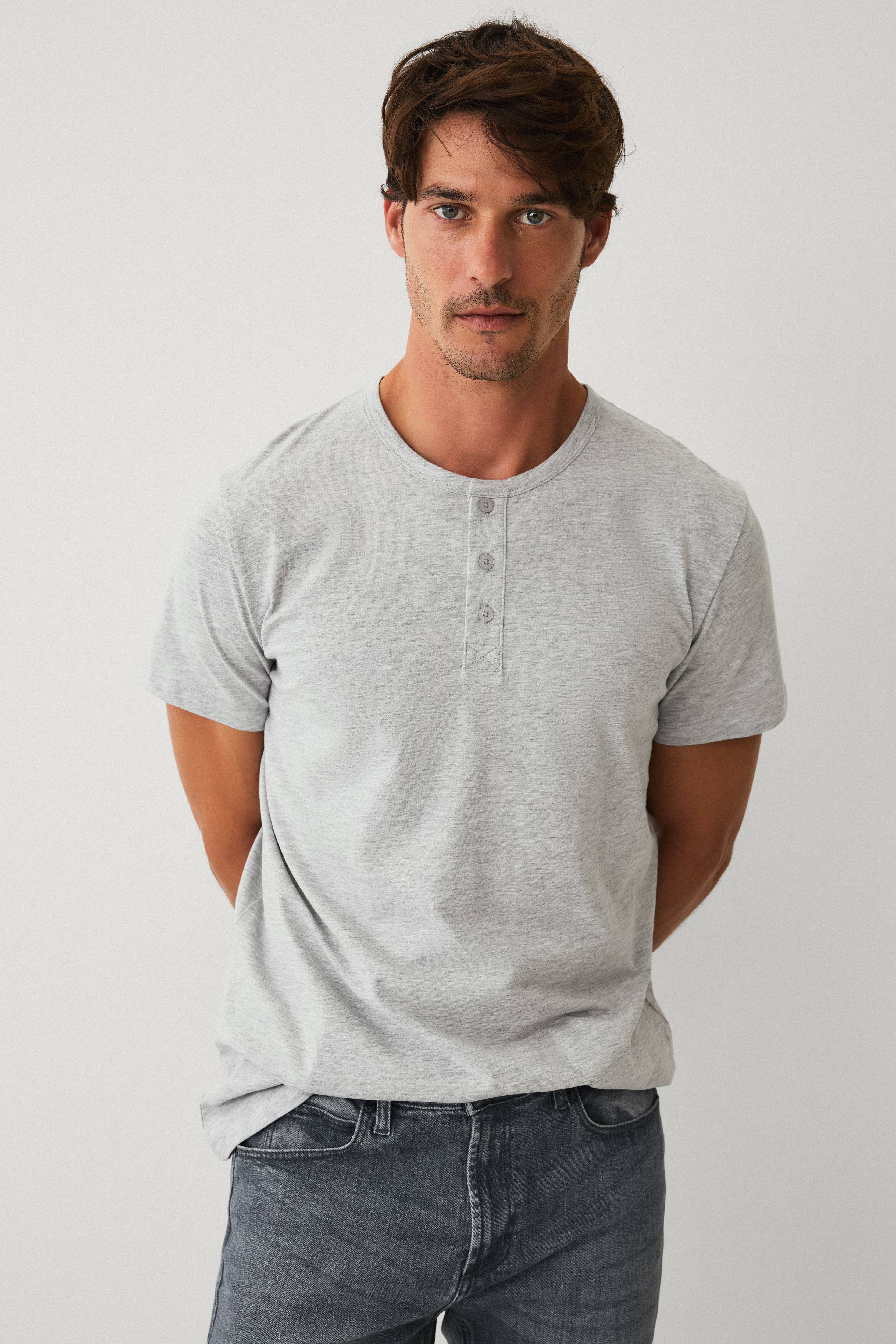 • Meleret model med kort knaplukning foran• Rund halsudskæring• Korte ærmer• Normal pasform