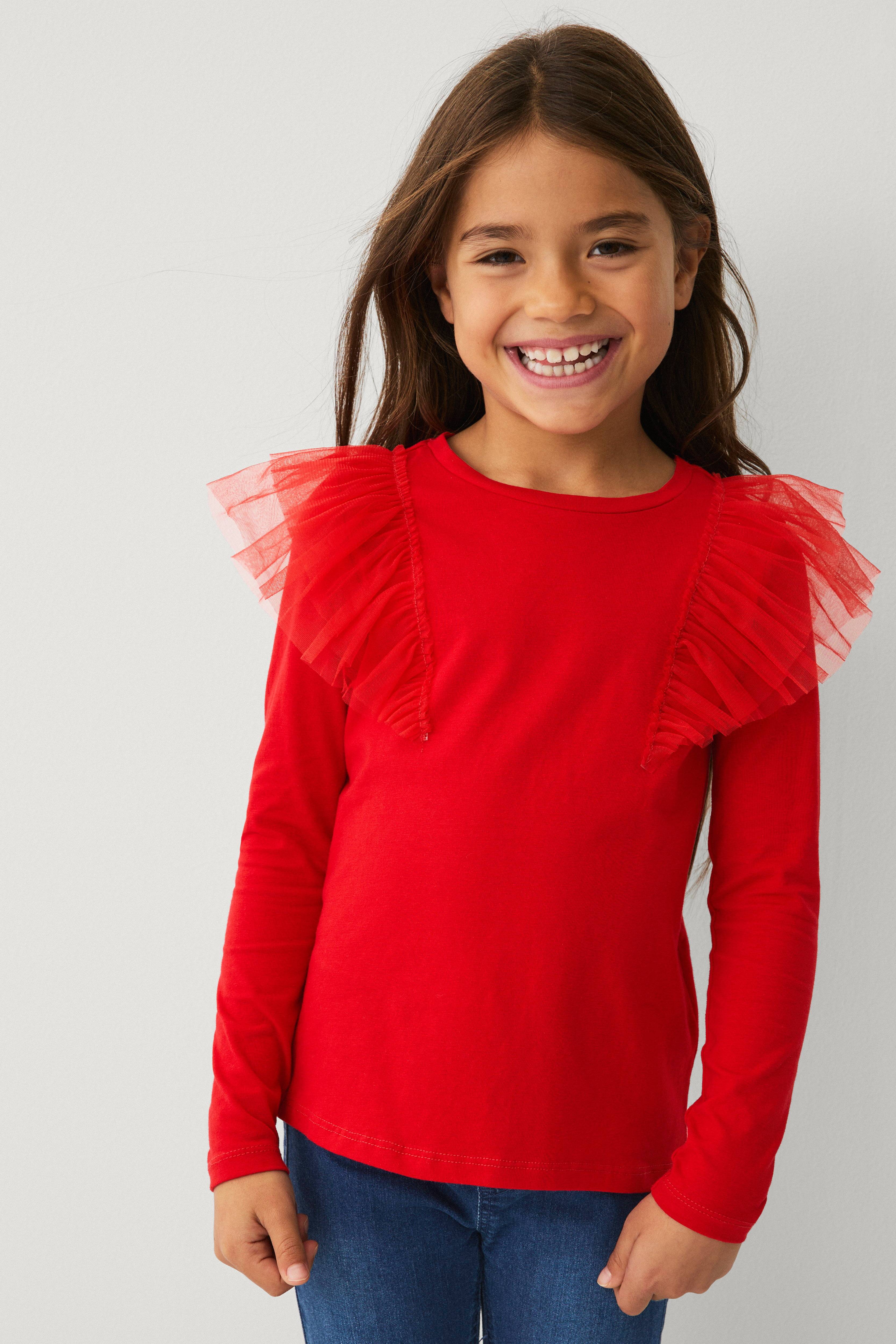 • Langærmet t-shirt i blød bomuld med et stræk• Rund halsudskæring• Påsyede volanter i tyl omkring skuldrene