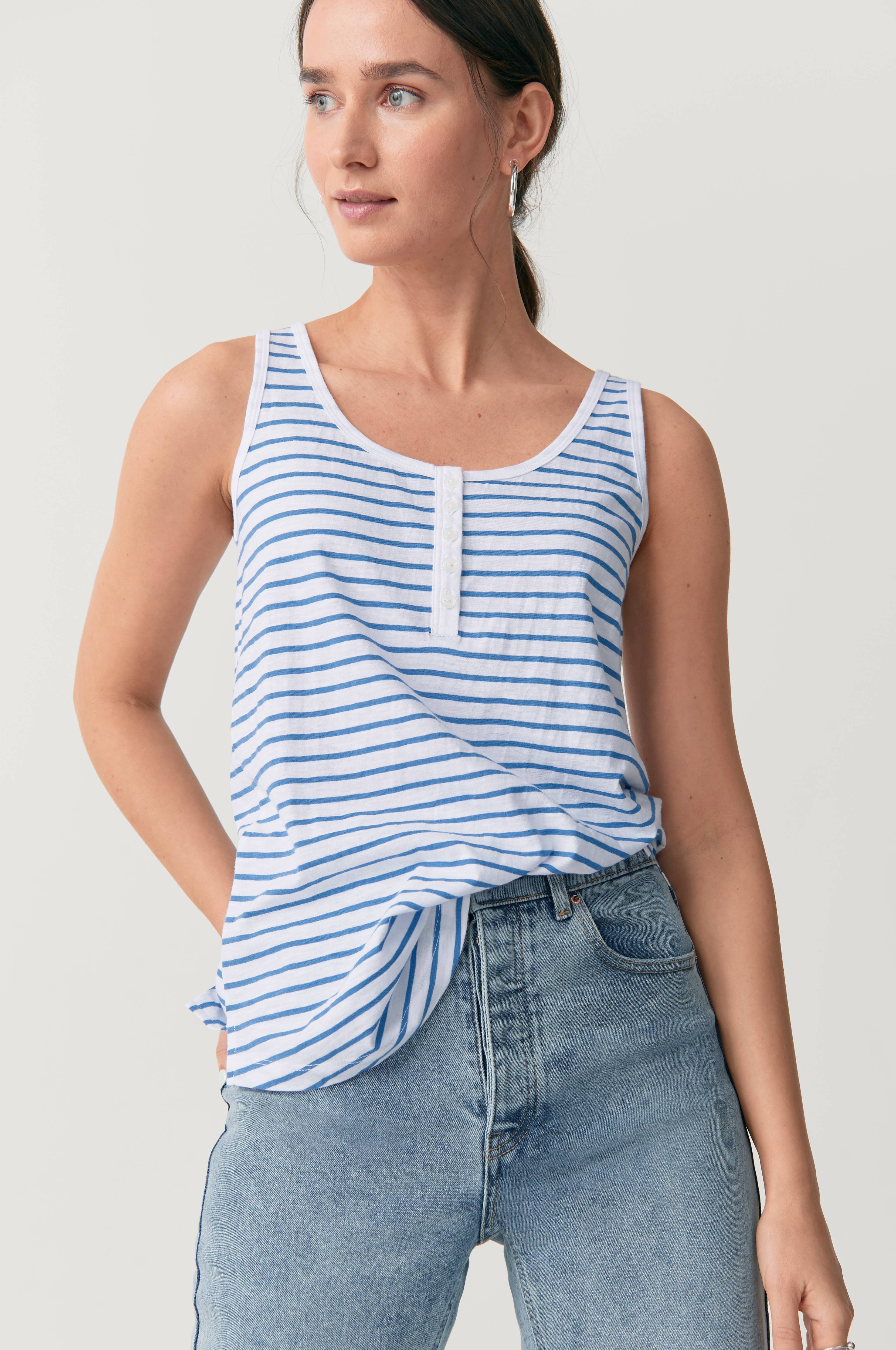 Basis tanktop i dejlig jersey. Model med rund hals og kort stolpelukning. Normal pasform. Noget afrundet kant forneden. Længde ca. 68 cm i str. 38/40.