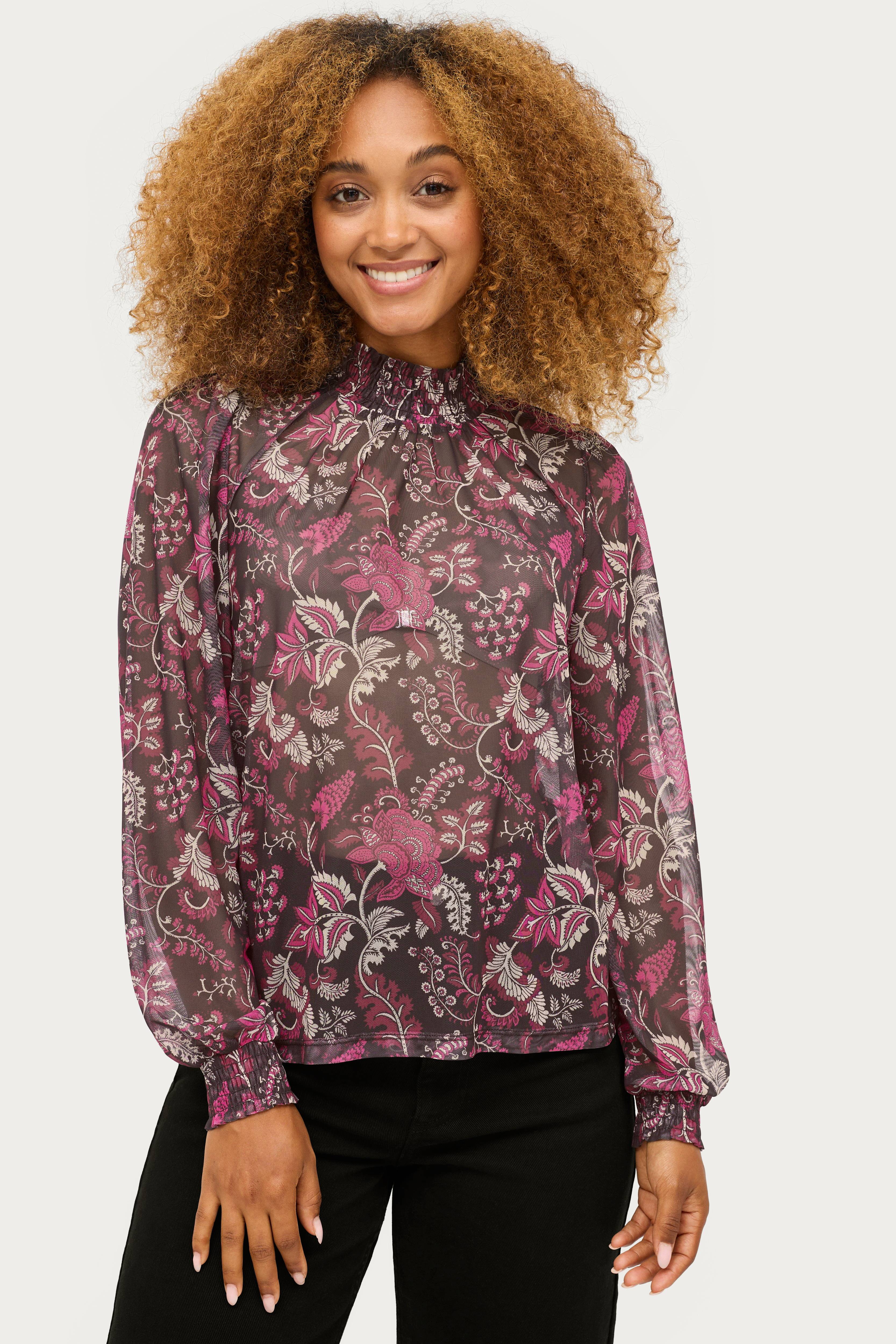 • Top i transparent meshtrikot• Printet mønster• Rund, smocket, høj halsudskæring• Lange ærmer med smock ved manchetterne• Længde: 61 cm i størrelse 34/36