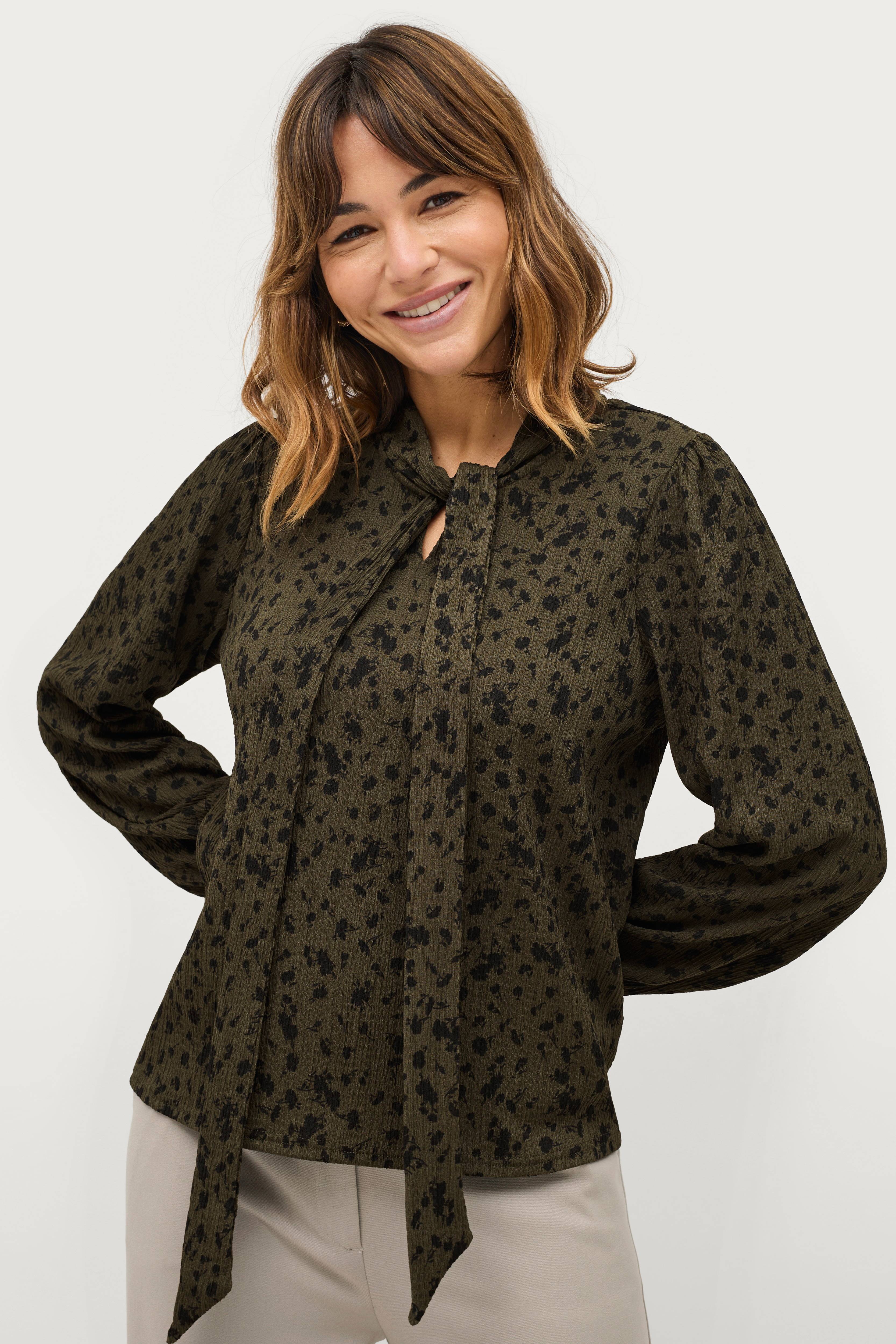 • Fremstillet af elastisk jersey med struktur• V-formet halsudskæring med bindebånd• Lange ærmer med elastik ved manchetterne• Længde: 61 cm i størrelse 38/40