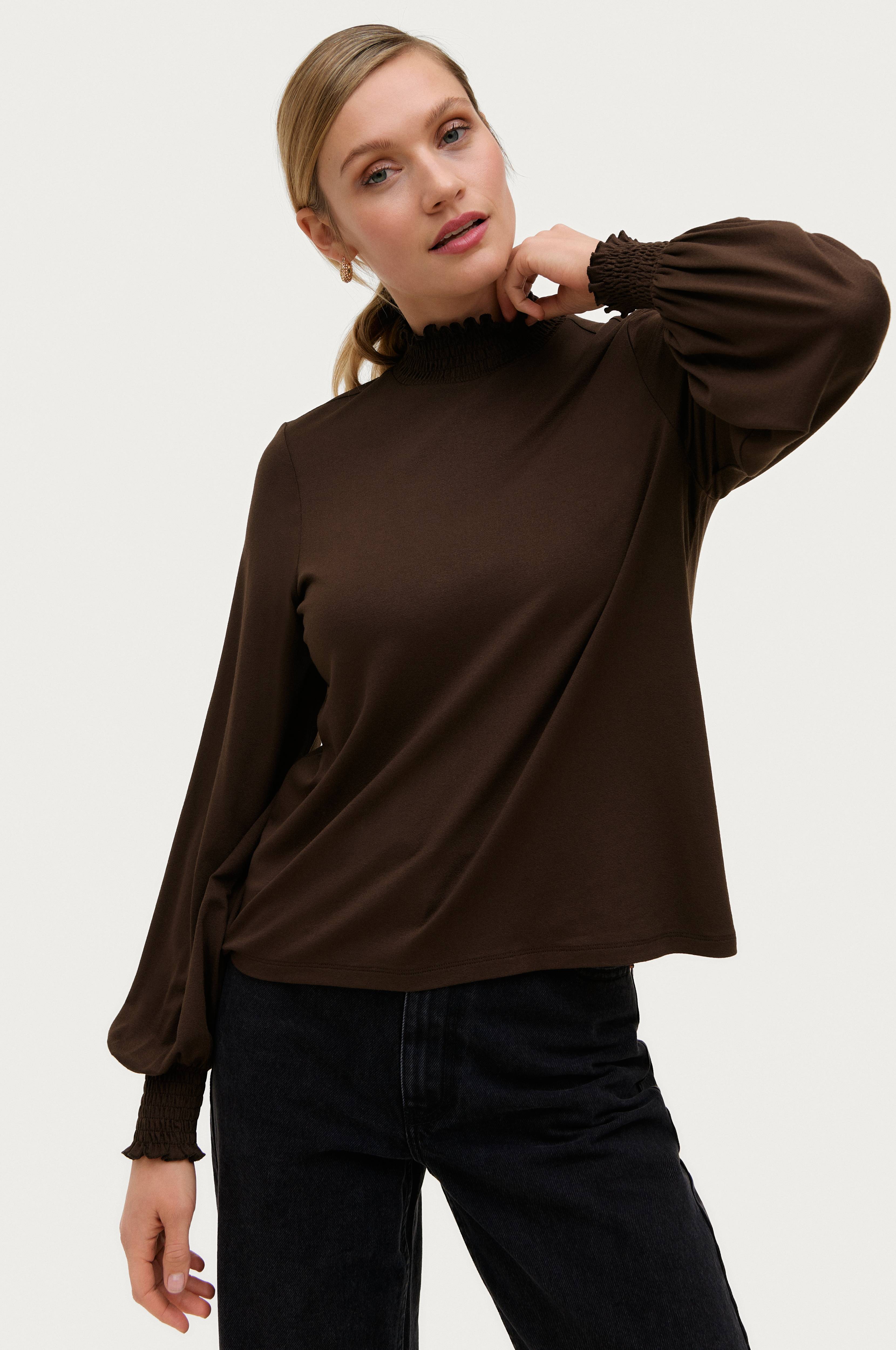 • Høj udskæring med smock• Lange ballonærmer med smock ved manchetterne• Fremstillet af viskosejersey• Længde: 59 cm i størrelse 34/36