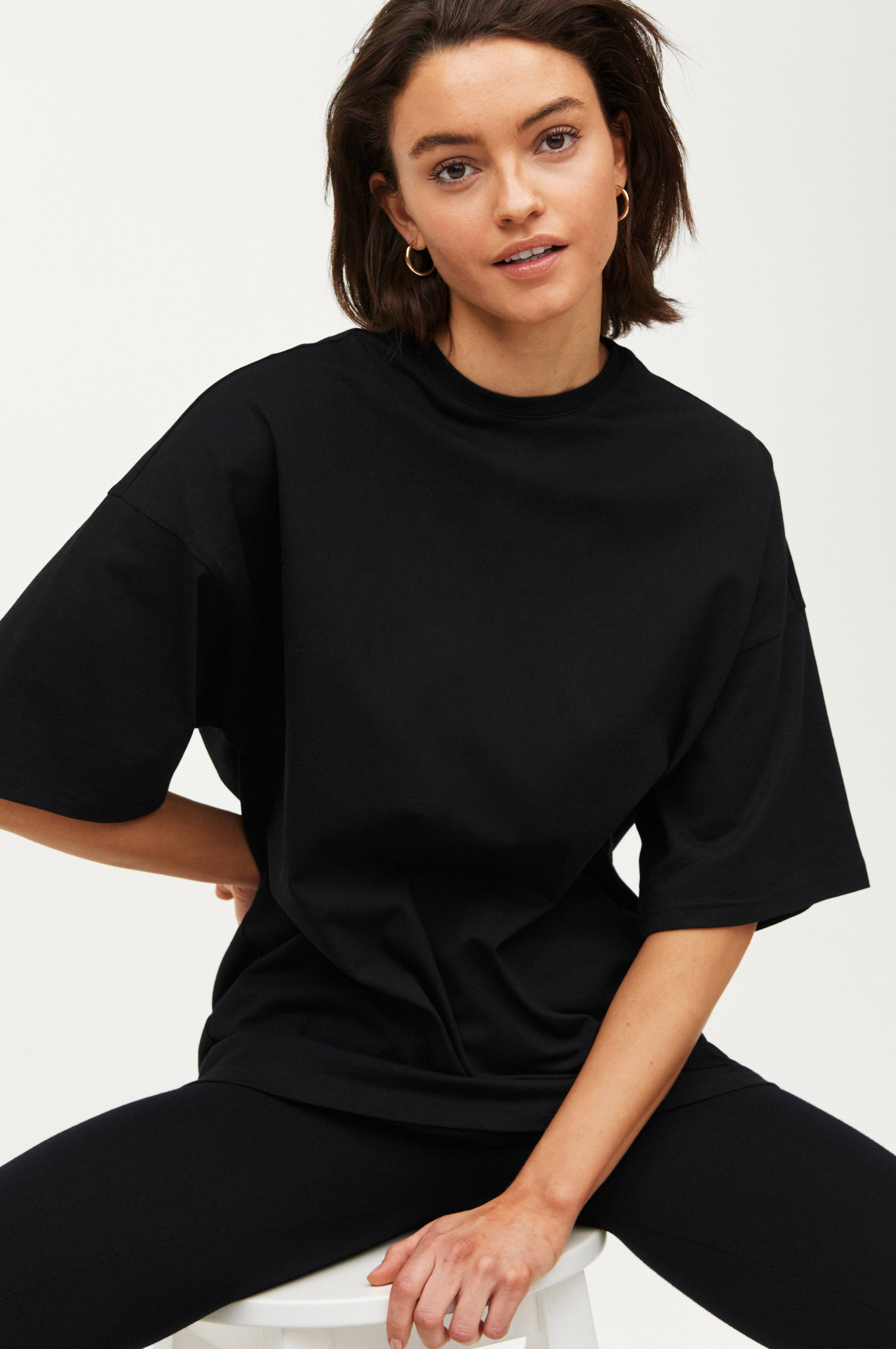 T-shirt i oversizemodel med rund hals og korte ærmer med lave skuldre. Fremstillet i kraftig bomuldsjersey. Længde ca. 74 cm i str. 34/36.