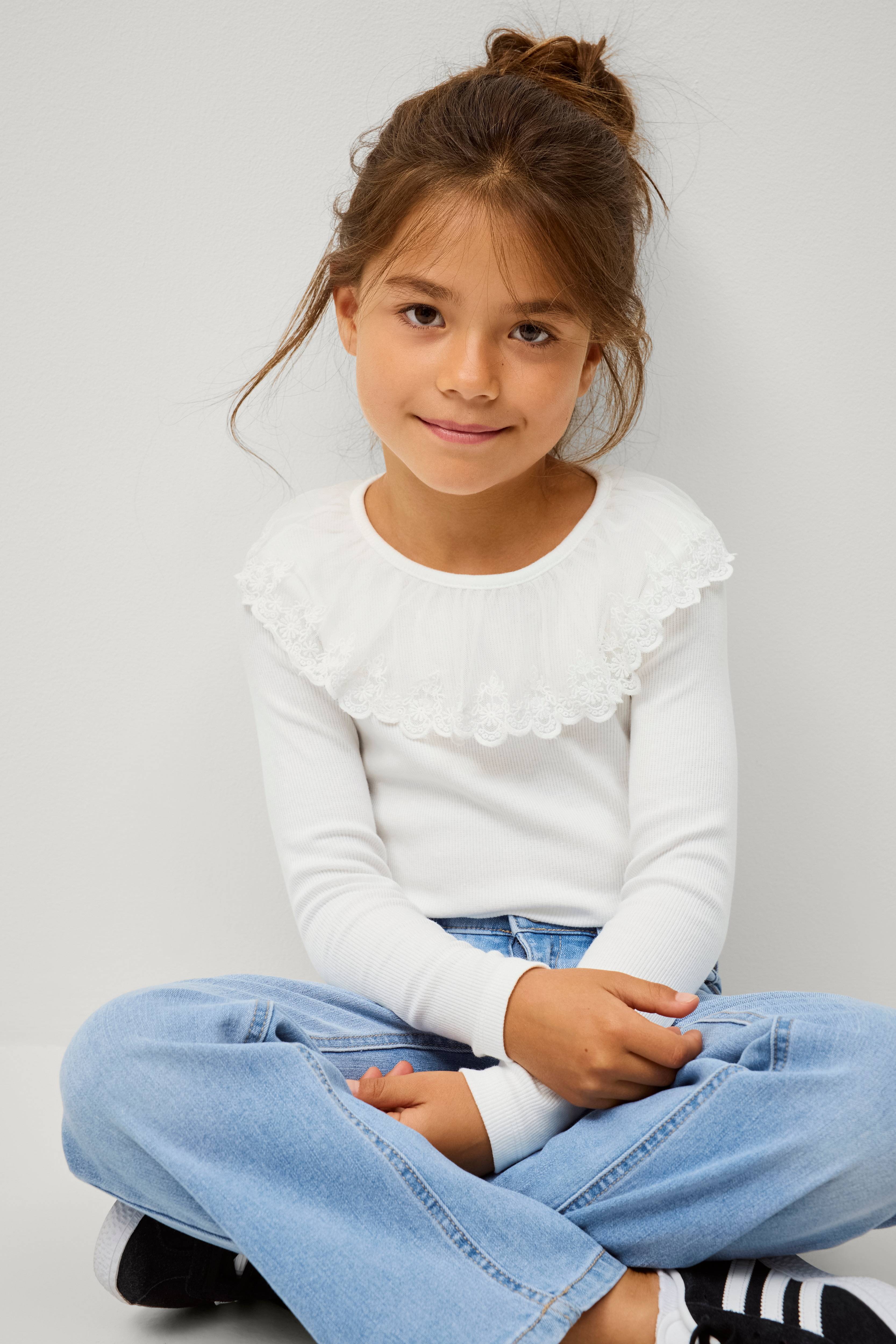 • Langærmet top i ribbet, elastisk jersey• Rund halsudskæring• Ventilation med knap i nakken• Rund blondekrave hele vejen rundt