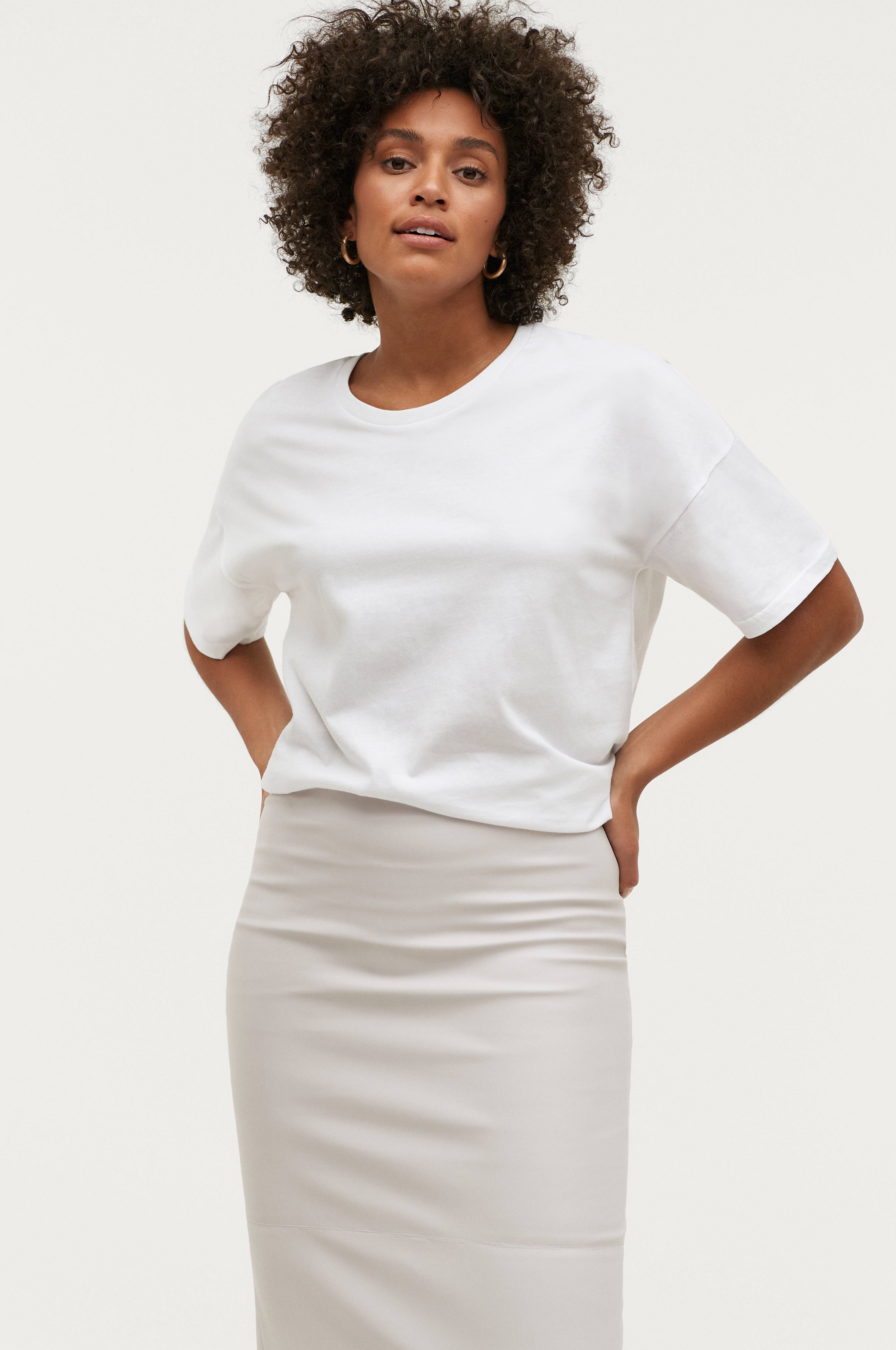 Kortærmet top i top i blød jersey af bomuld. Rund halsudskæring med ribkant. Længde ca. 67 cm i str. 34/36.