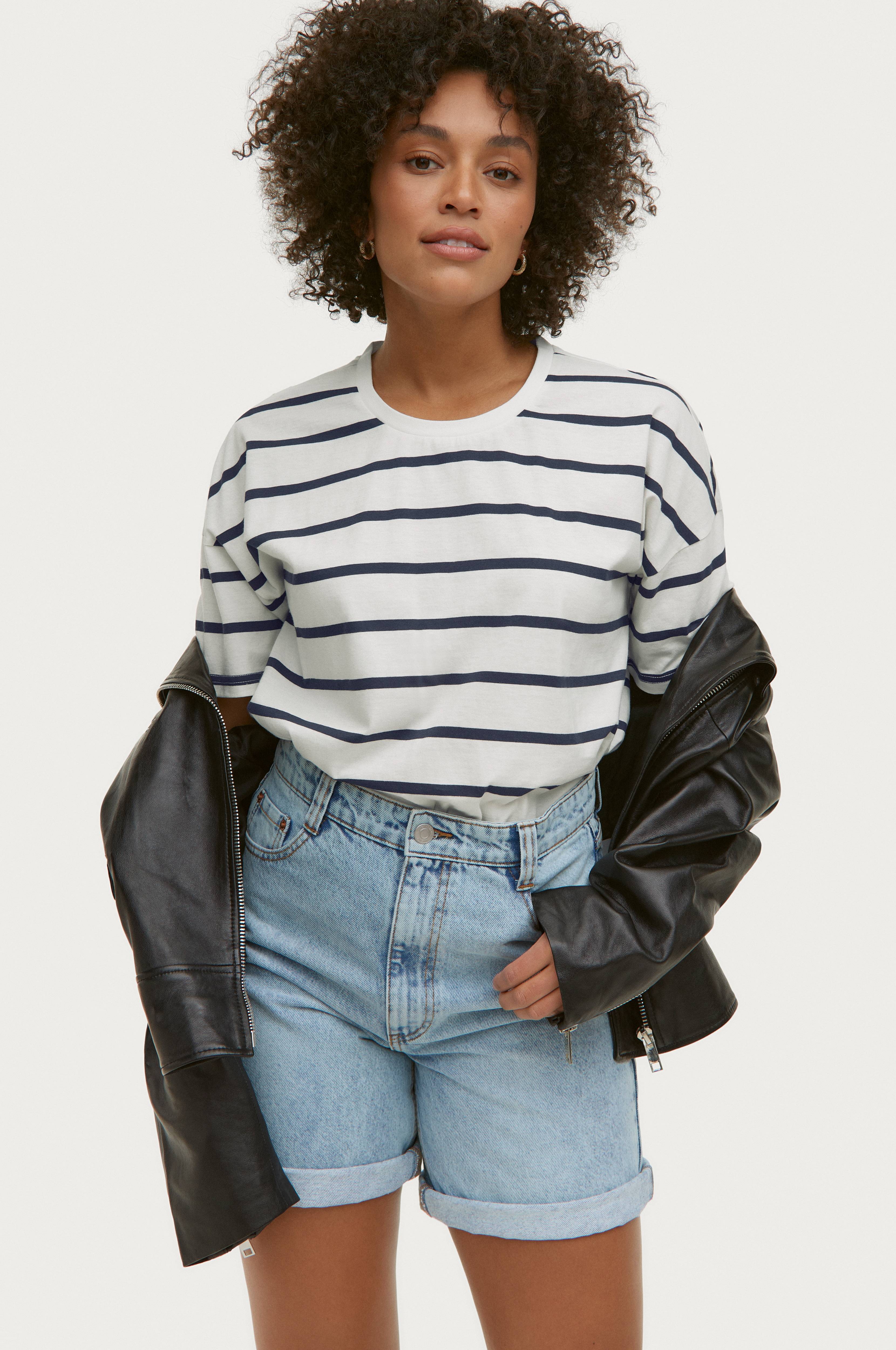Stribet kortærmet top i blød bomuldsjersey. Rund hals.
