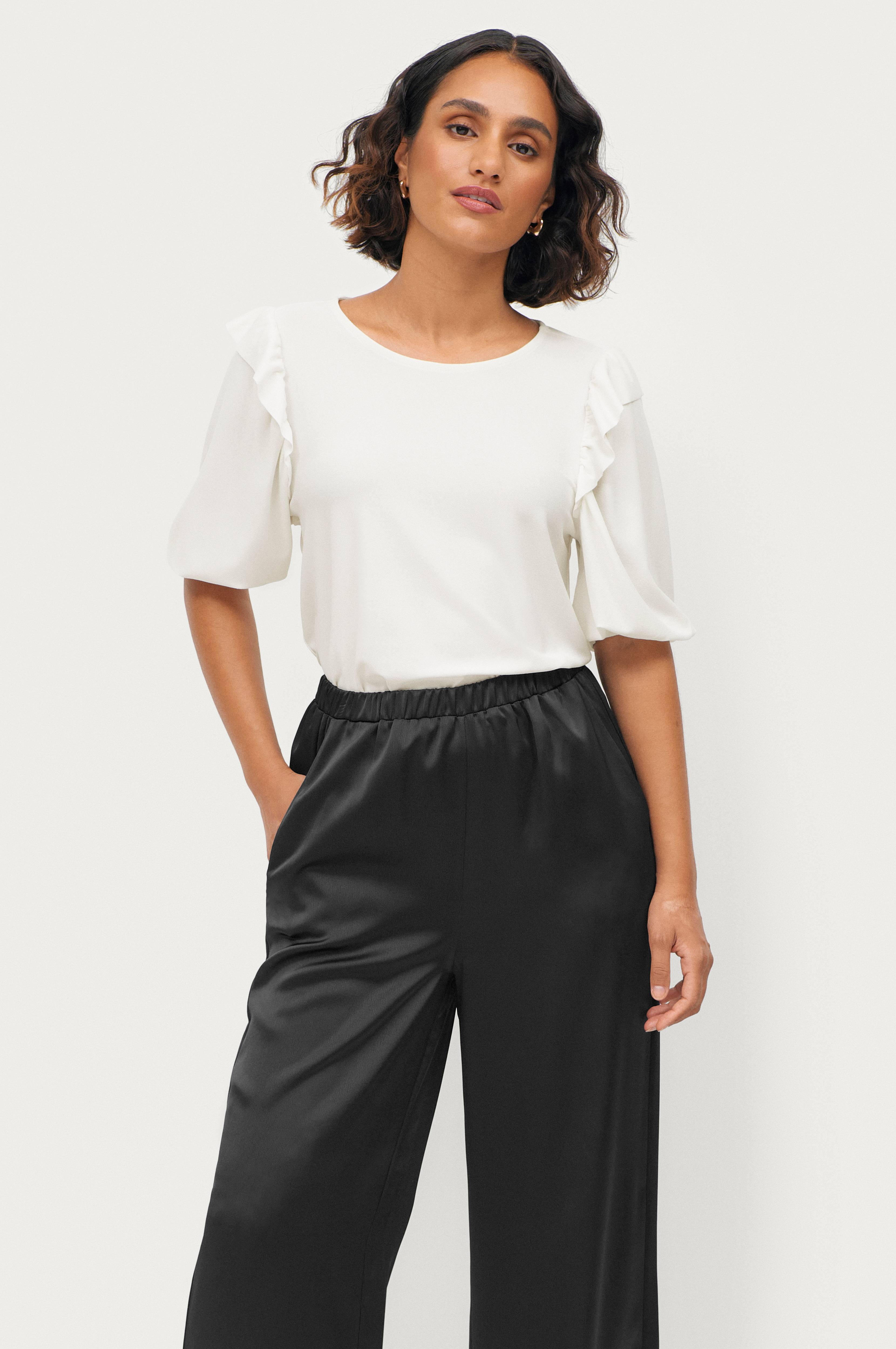 • Halvlange ballonærmer• Volanter på skuldrene• Blød strækkvalitet• Længde: 62 cm i størrelse 34/36