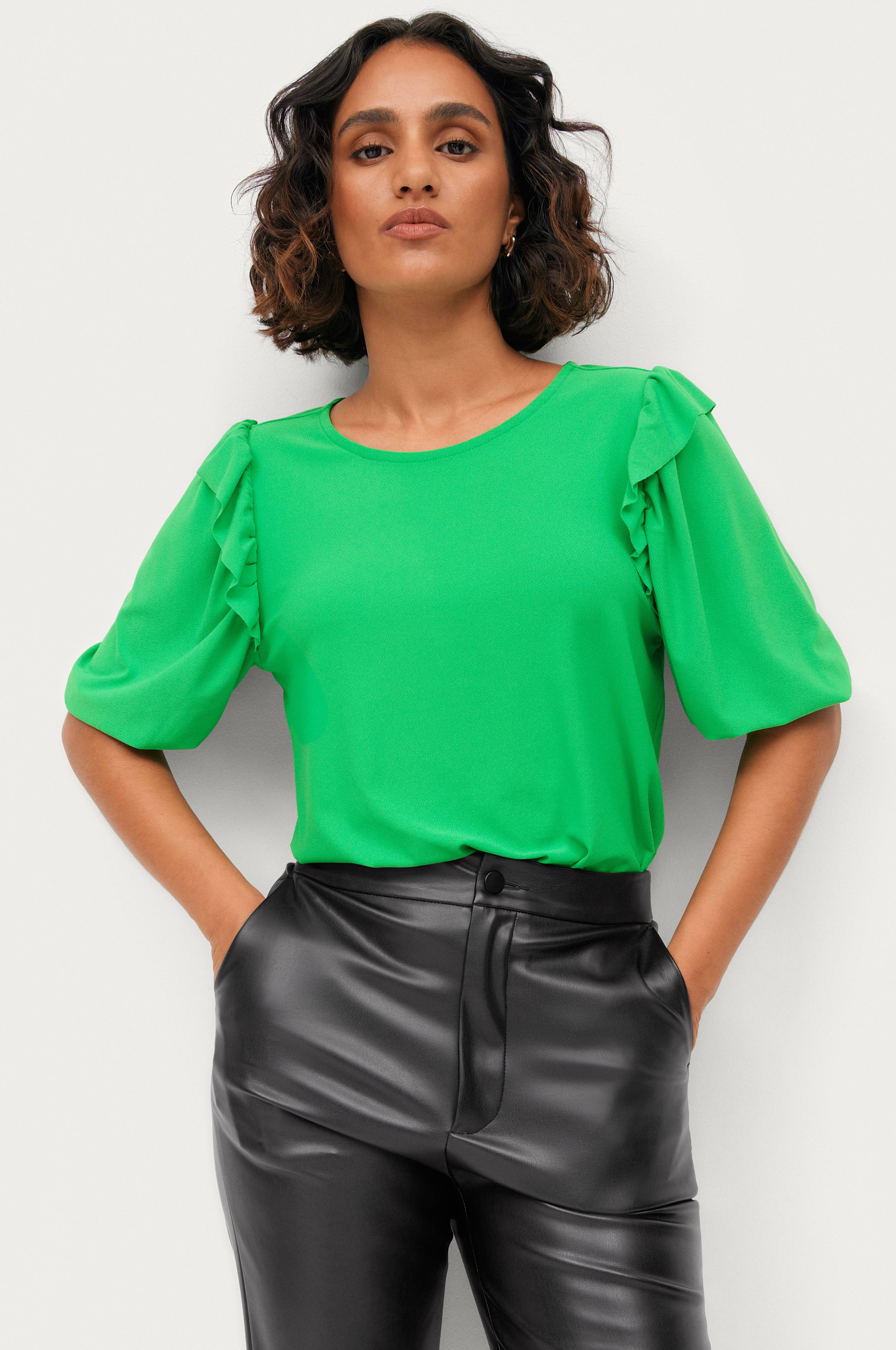 • Halvlange ballonærmer• Volanter på skuldrene• Blød strækkvalitet• Længde: 62 cm i størrelse 34/36
