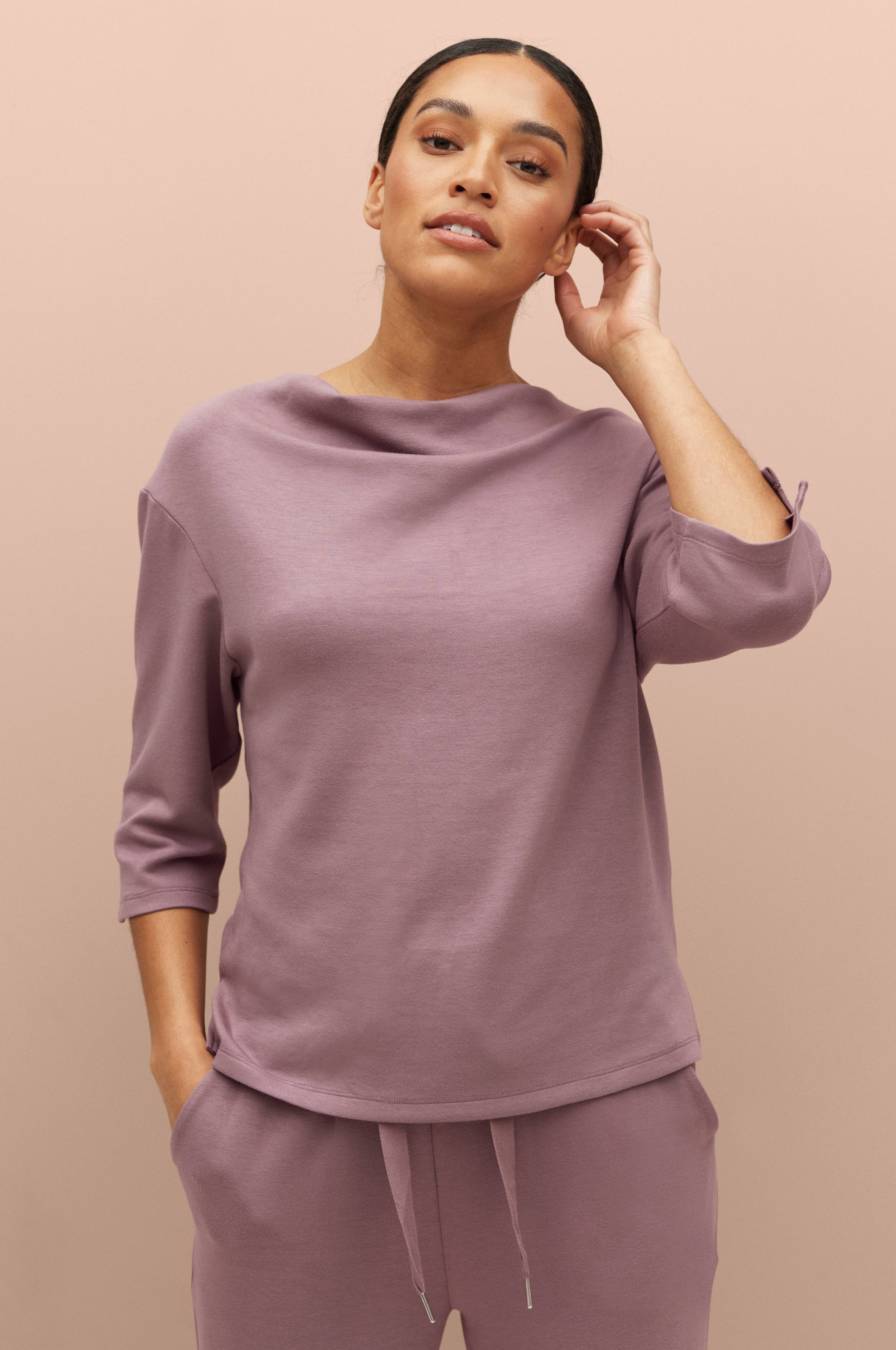 Top Lava i blød jersey af modalblanding. Draperet vandfaldsudskæring foran, 3/4-lange ærmer med slids i ærmekant og sideslids forneden. Længde ca. 64 cm i str. 34/36.