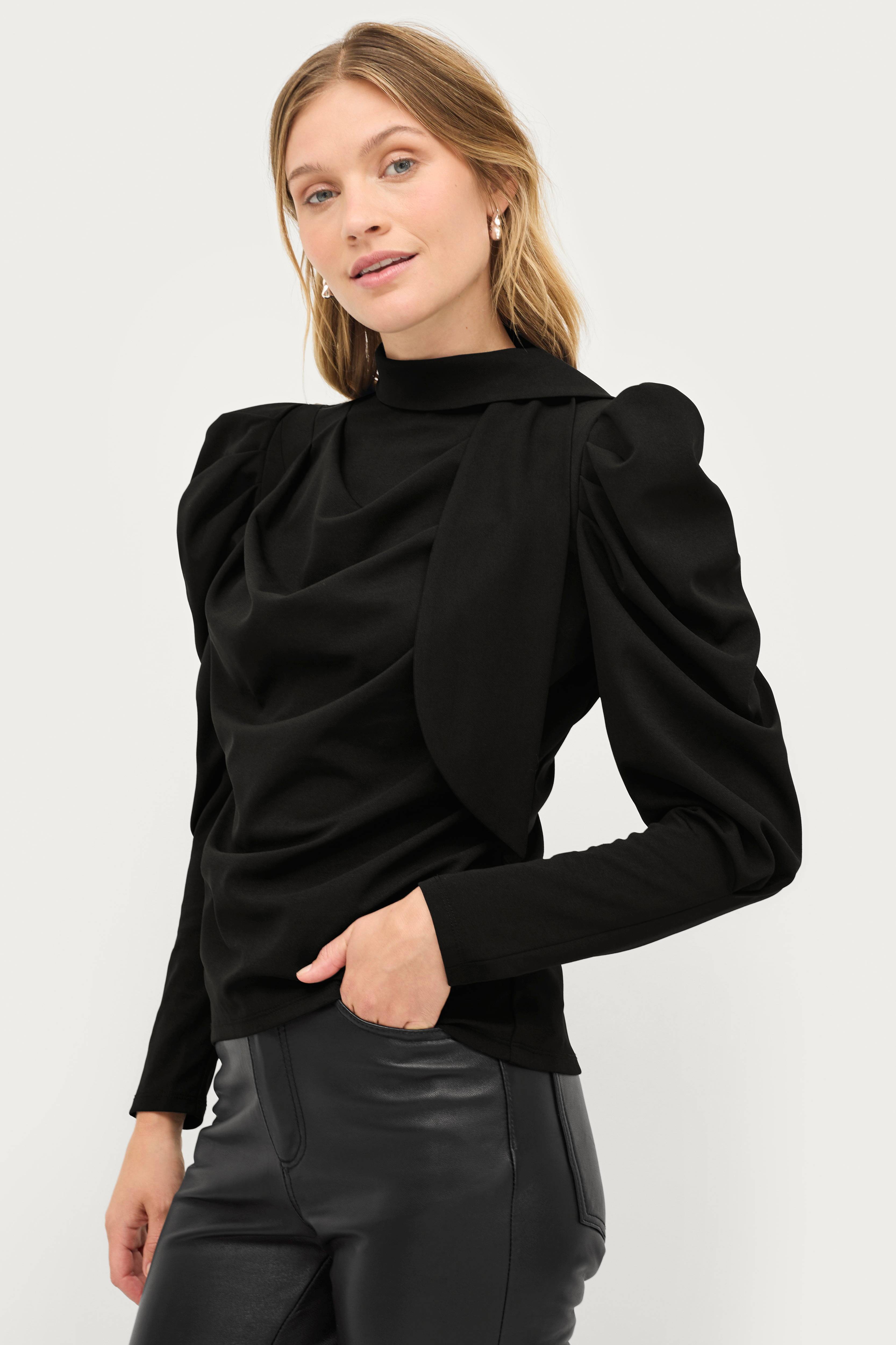 • Figursyet top • Lange ballonærmer med lægge på skuldrene • Høj halsudskæring med snøring i siden • Drapering foran • Ventilation med knapper i nakken • Længde: 58 cm i størrelse 34/36