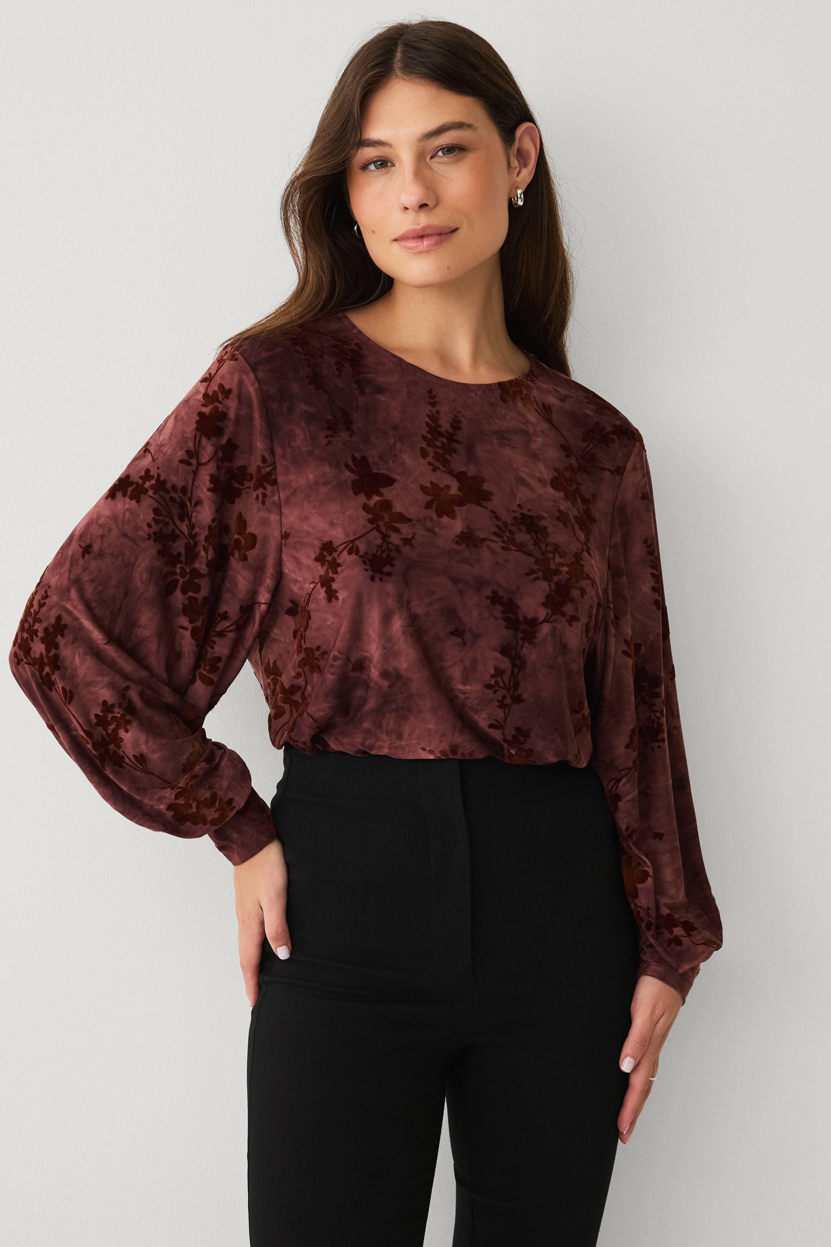 • Elastisk top med strukturmønster i fløjl• Rund halsudskæring• Lange ballonærmer• Manchetter ved manchetterne• Længde: 58 cm i størrelse S