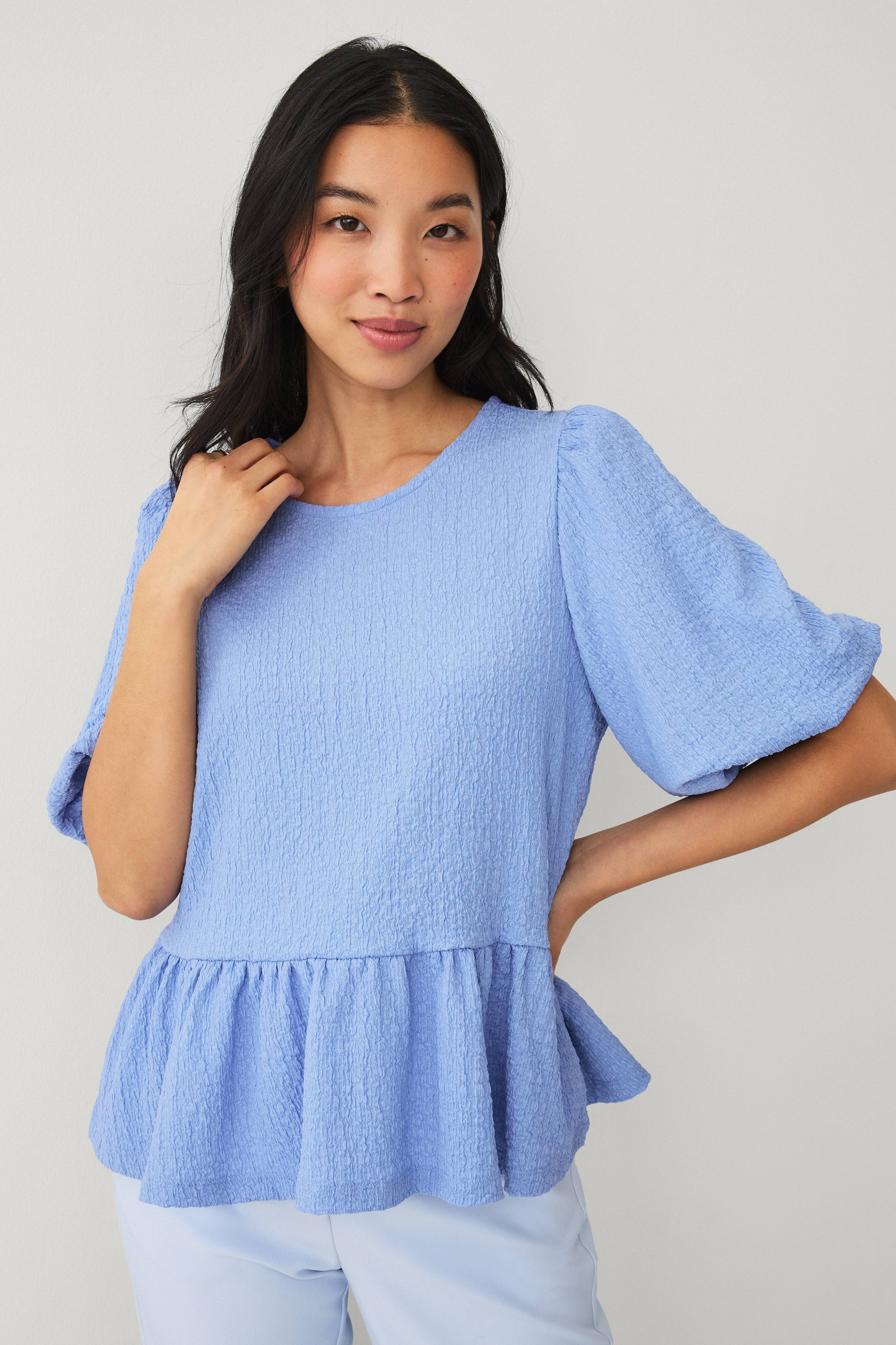 • Behandlet top• Rund halsudskæring• Korte ballonærmer• Volant ved nederste kant• Normal pasform• Længde: 59 cm i størrelse S