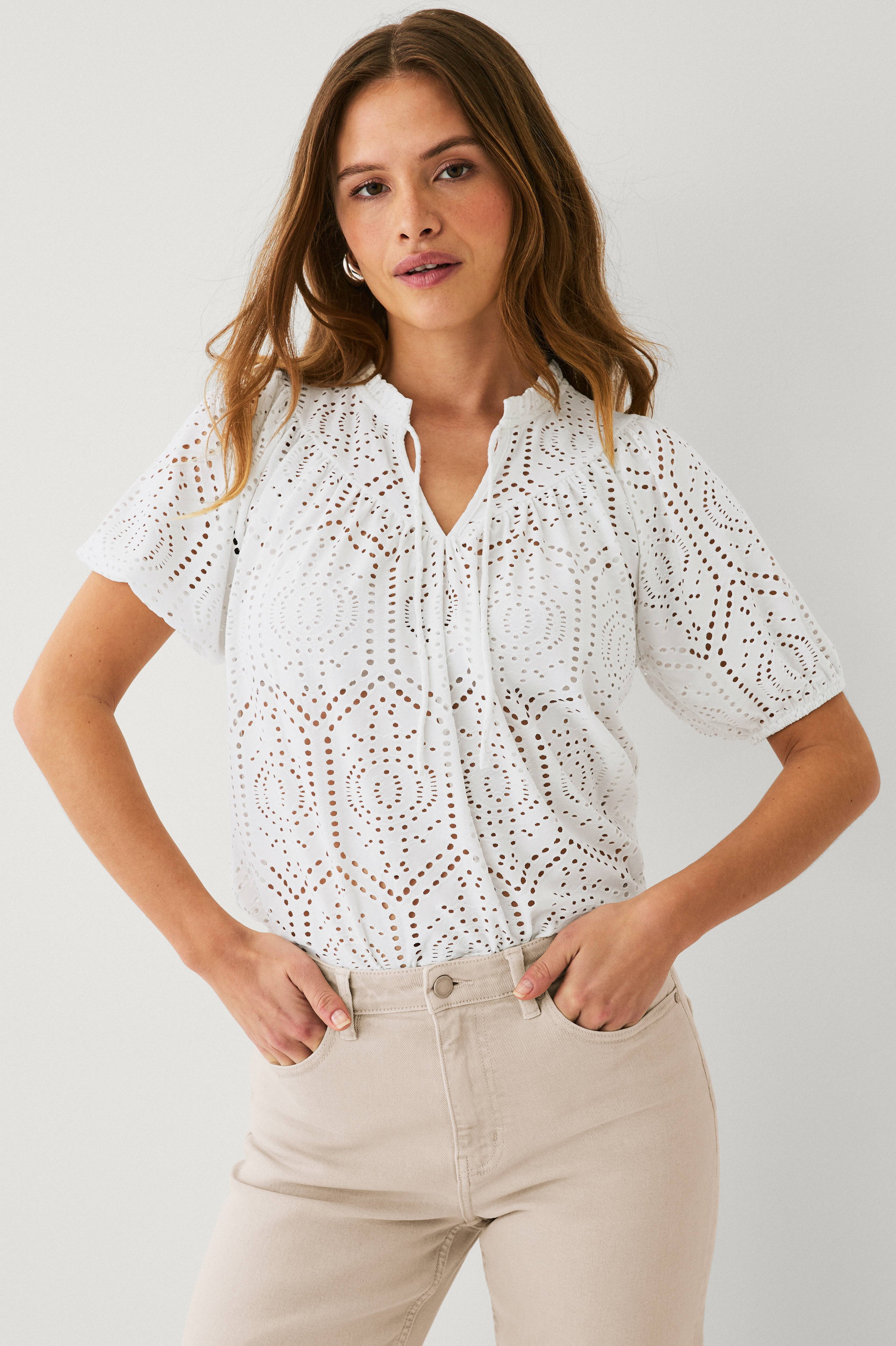 • Top i blød polyesterblanding med et dekorativt, semitransparent hulmønster • Afrundet halsudskæring med tyndt, dekorativt bindebånd og kort flæsekant • Korte ballonærmer med elastik ved manchetterne • Søm med bølgeformet effekt på toppen • Længde: 60 cm i størrelse S