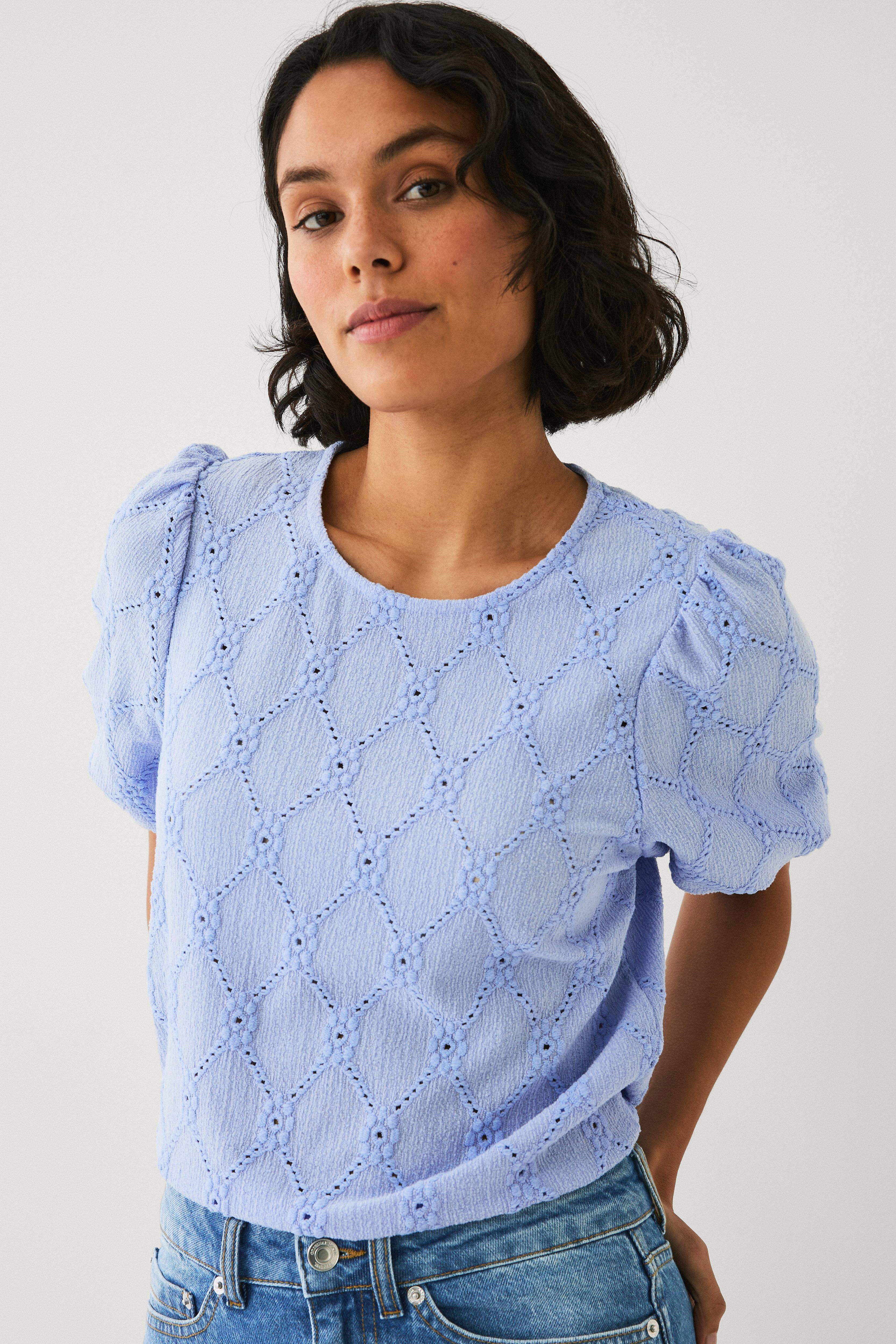 • Top i semitransparent, tyndt materiale med et blomstermønster og dekorative huller med kort ballonærme med elastik ved manchetterne• Afrundet halsudskæring• Længde: 54 cm i størrelse S