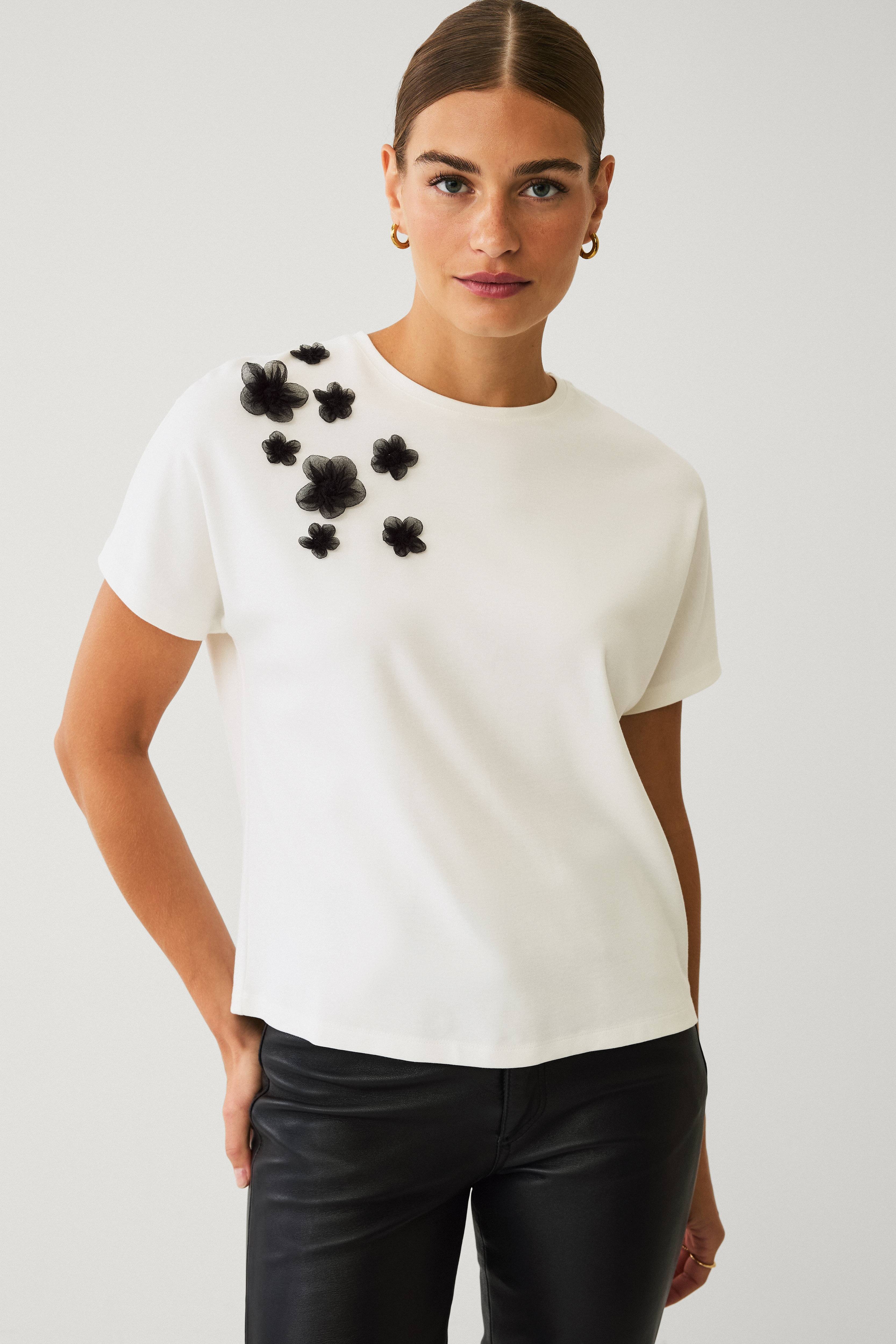 • Top med korte korte ærmer• Rund halsudskæring• Påsyede blomster oppe foran• Længde: 55 cm i størrelse S