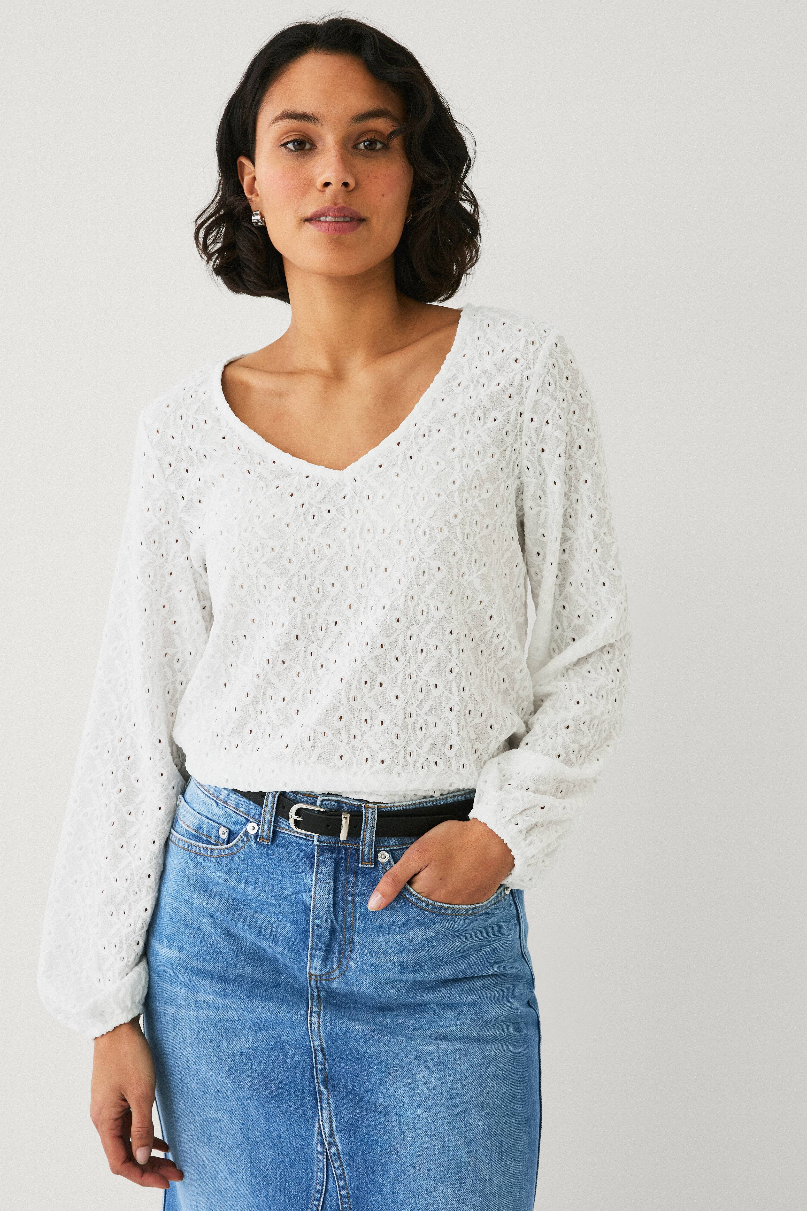 • Top i tyndt materiale med vævet, blomsterformet struktur og hulmønster• V-formet halsudskæring• Lange ballonærmer med elastik ved manchetterne• Lige pasform• Længde: 58 cm i størrelse S