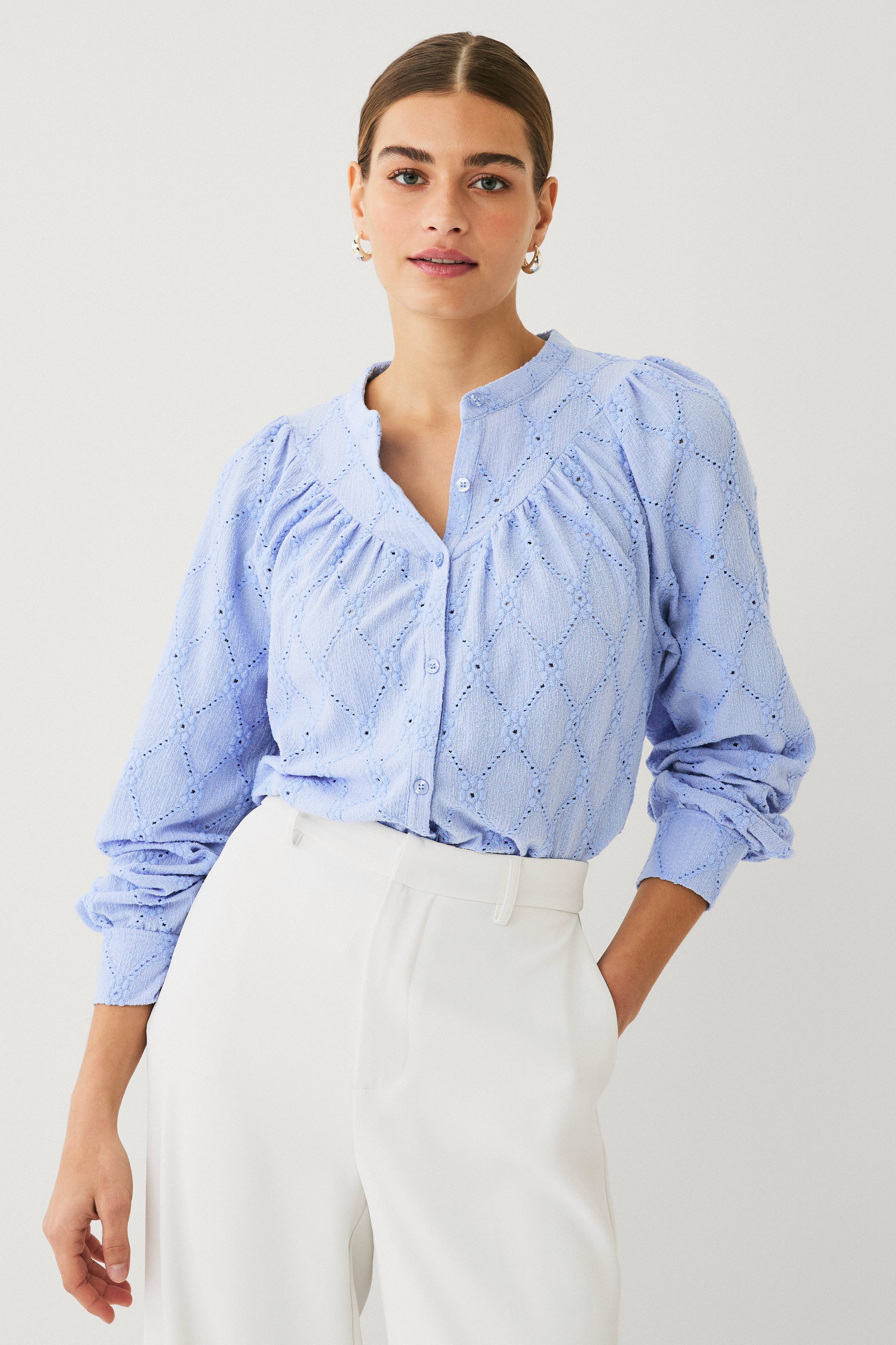• Bluse med vævet struktur med et hulmønster• Knapstolpe foran med dekorative knapper• Afrundet halsudskæring• Lange arme med manchet og knap ved manchetterne• Flæsedesign på den øverste halvdel• Nedsænket skulder• Længde: 61 cm i størrelse S