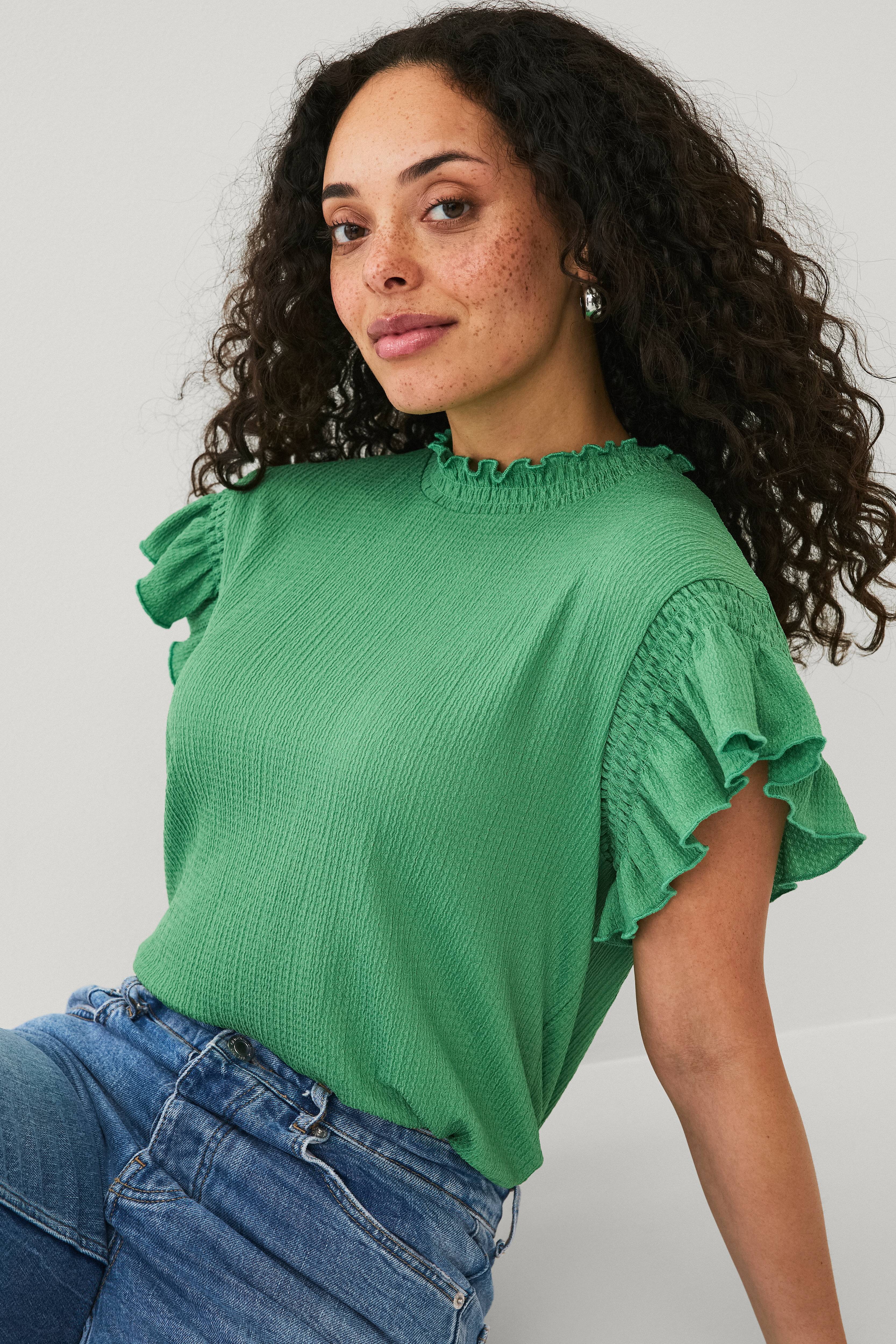 • Top i elastisk, tekstureret materiale• Kort, smocket arm med flæsedesign• Afrundet, halvhøj, smocket halsudskæring med lille flæsekant• Længde: 58 cm i størrelse s