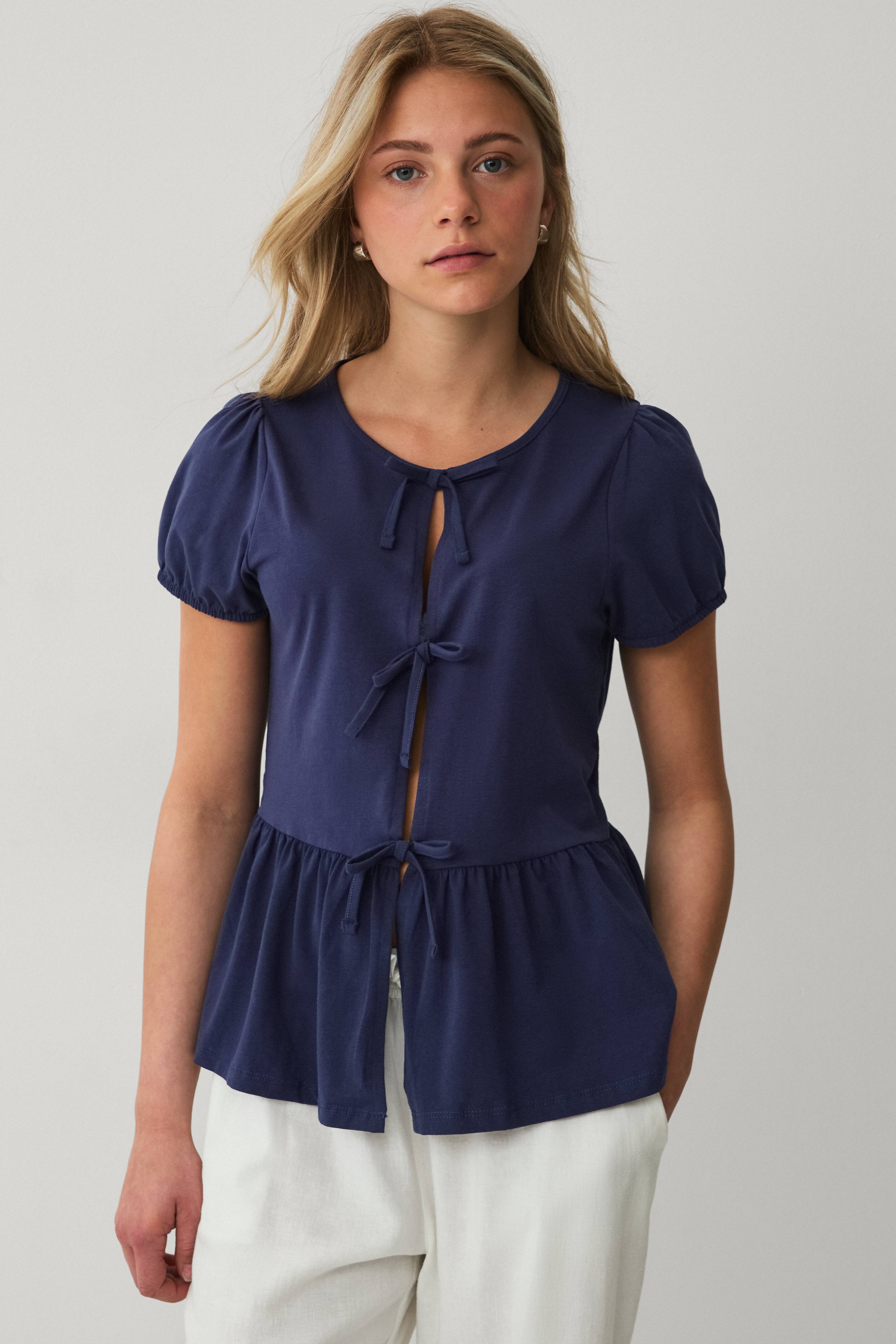 • Top i blød, elastisk bomuld• Peplumdesign med volant ved nederste kant• Rund halsudskæring• Åbning ved fronten med påsyede, dekorative bindebånd• Korte korte ærmer med elastik ved manchetterne