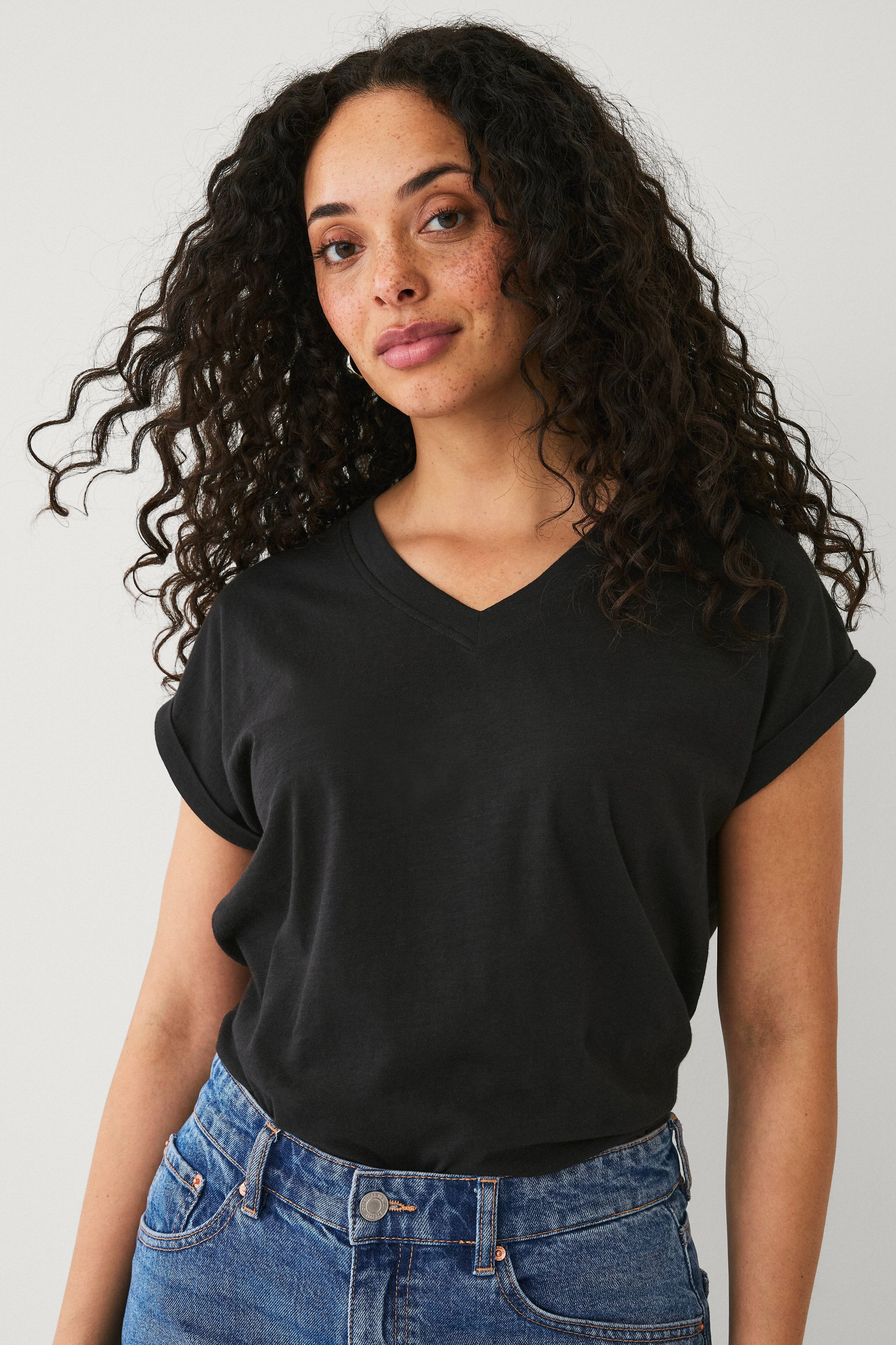 • Top i bomuld med v-formet halsudskæring• Korte ærmer med syede ærmeafslutninger