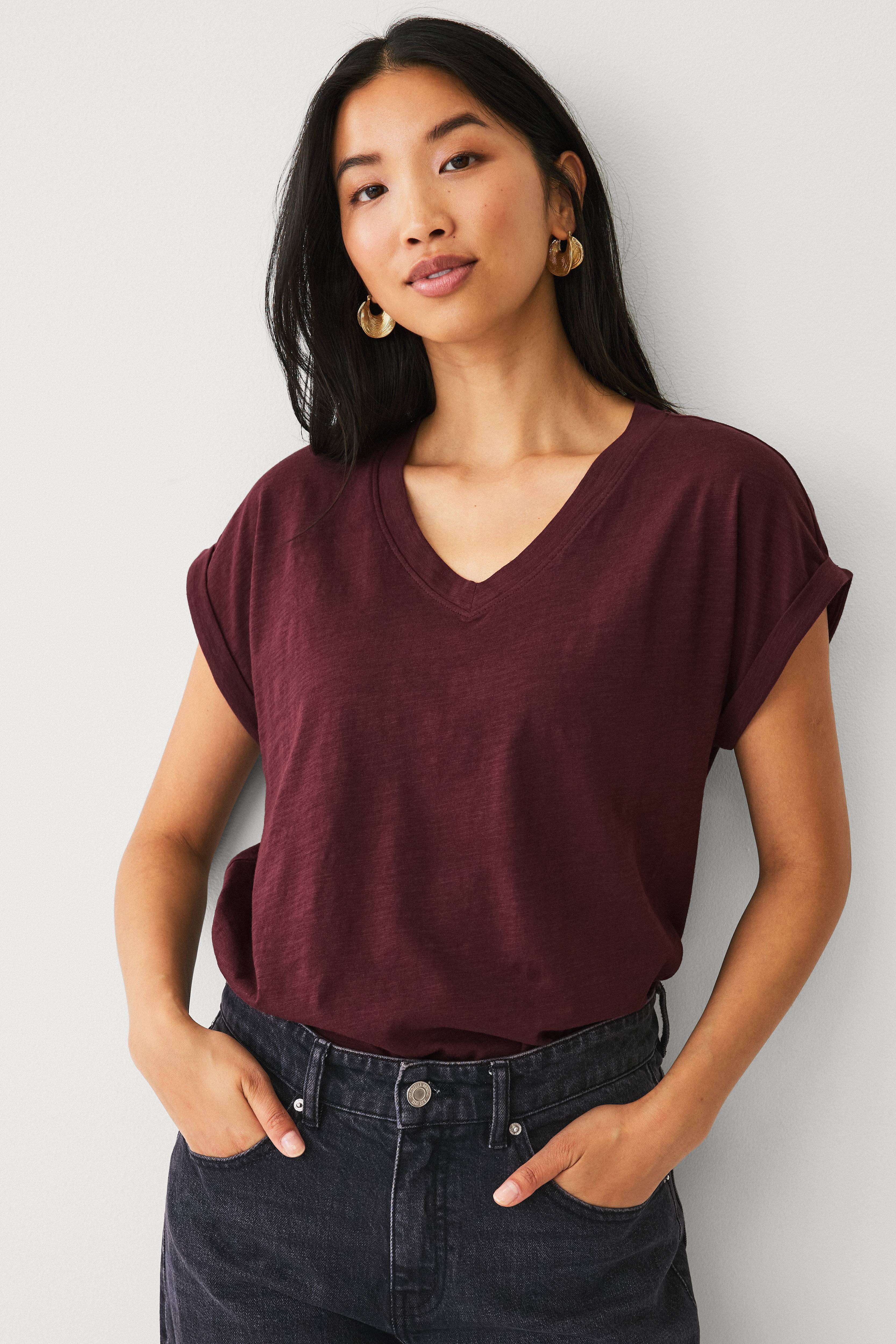 • Top i bomuld med v-formet halsudskæring• Korte ærmer med syede ærmeafslutninger