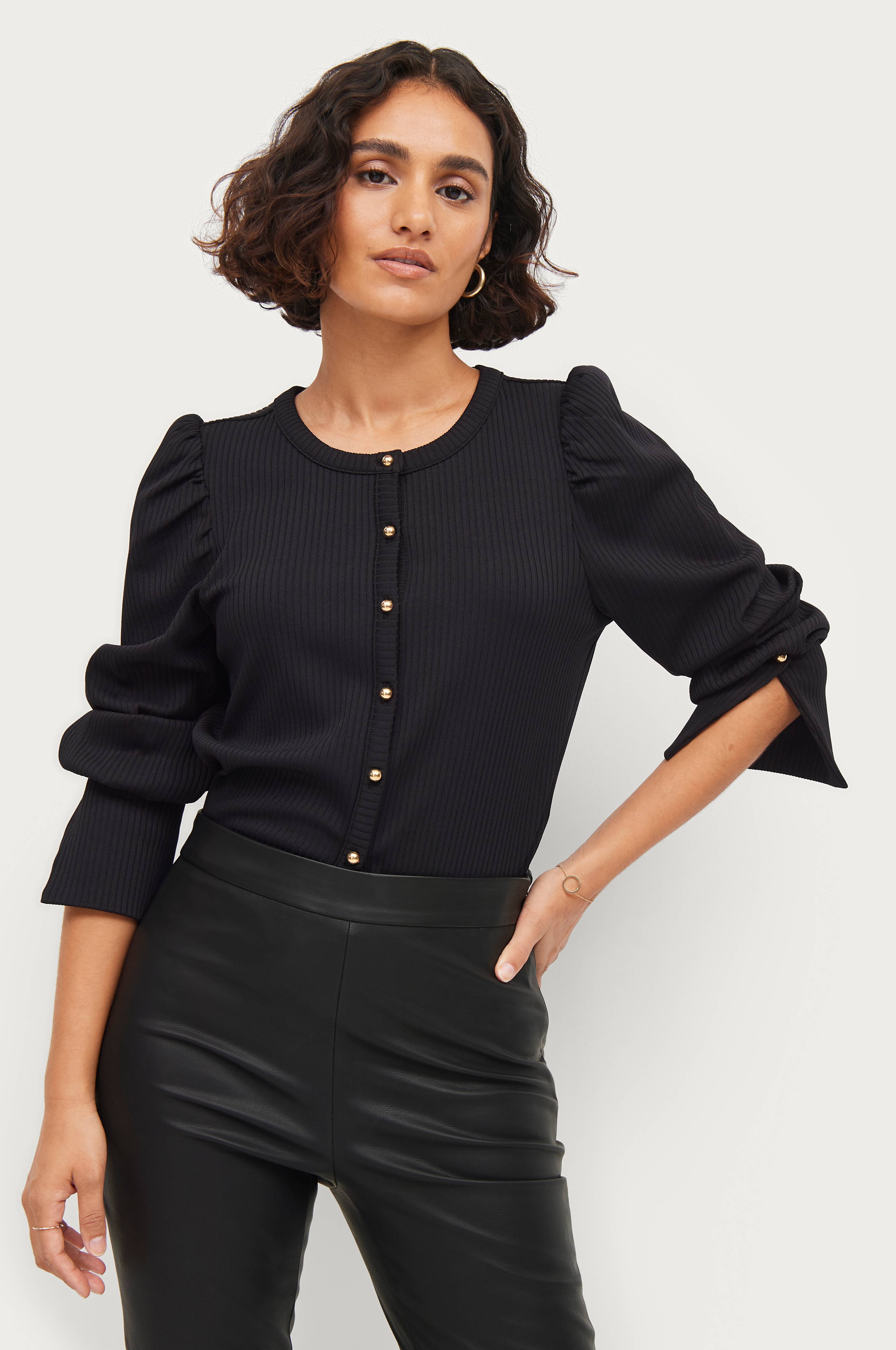 • Ribbet top• Guldfarvede knapper foran• Lange ballonærmer med slids ved ærmeafslutningerne• Længde: 57 cm i størrelse 34/36