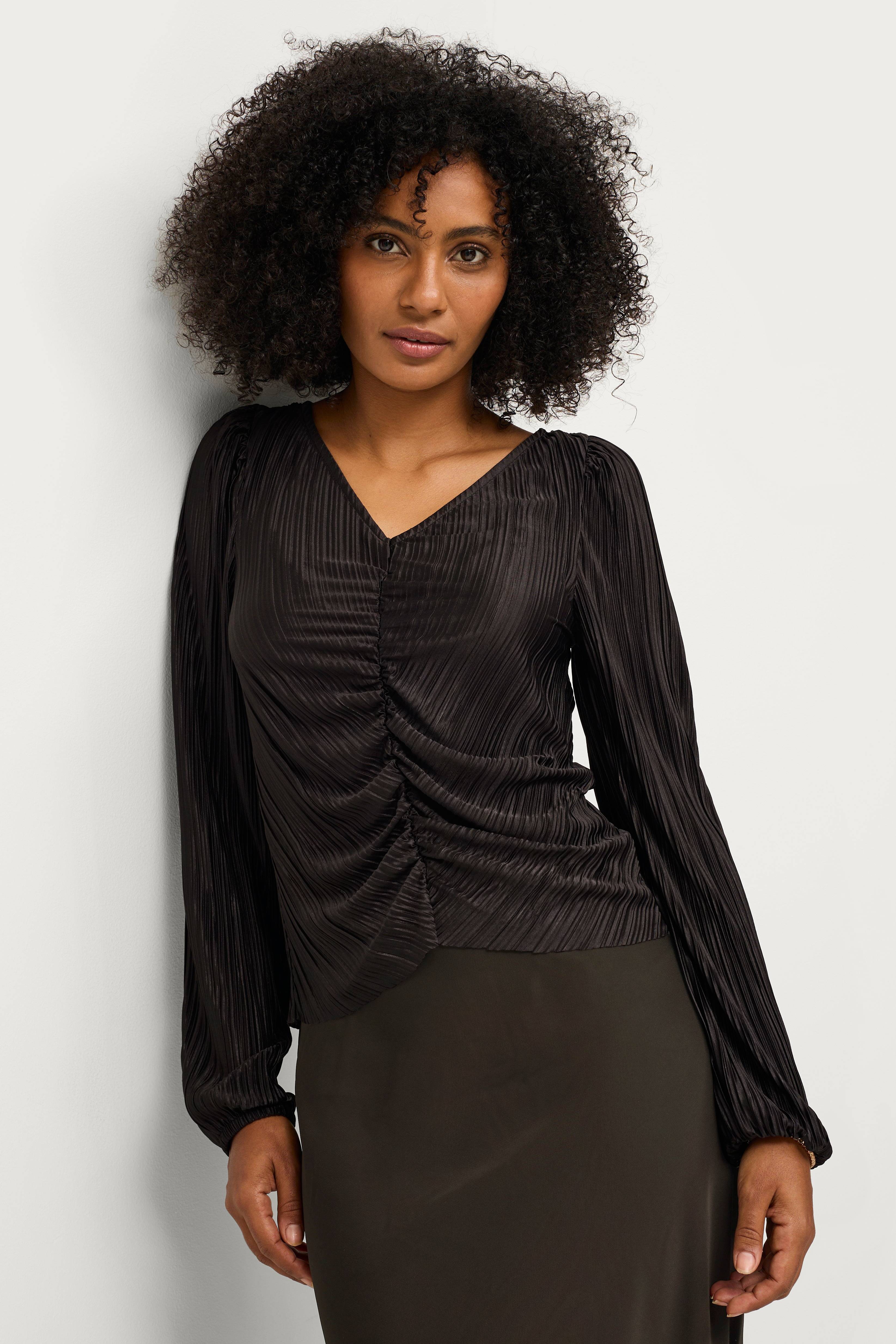 • Figursyet, plisseret model• V-formet halsudskæring• Elastisk drapering foran• Langt ballonærme med elastisk bånd ved manchetterne• Længde: 55 cm i størrelse 34/36