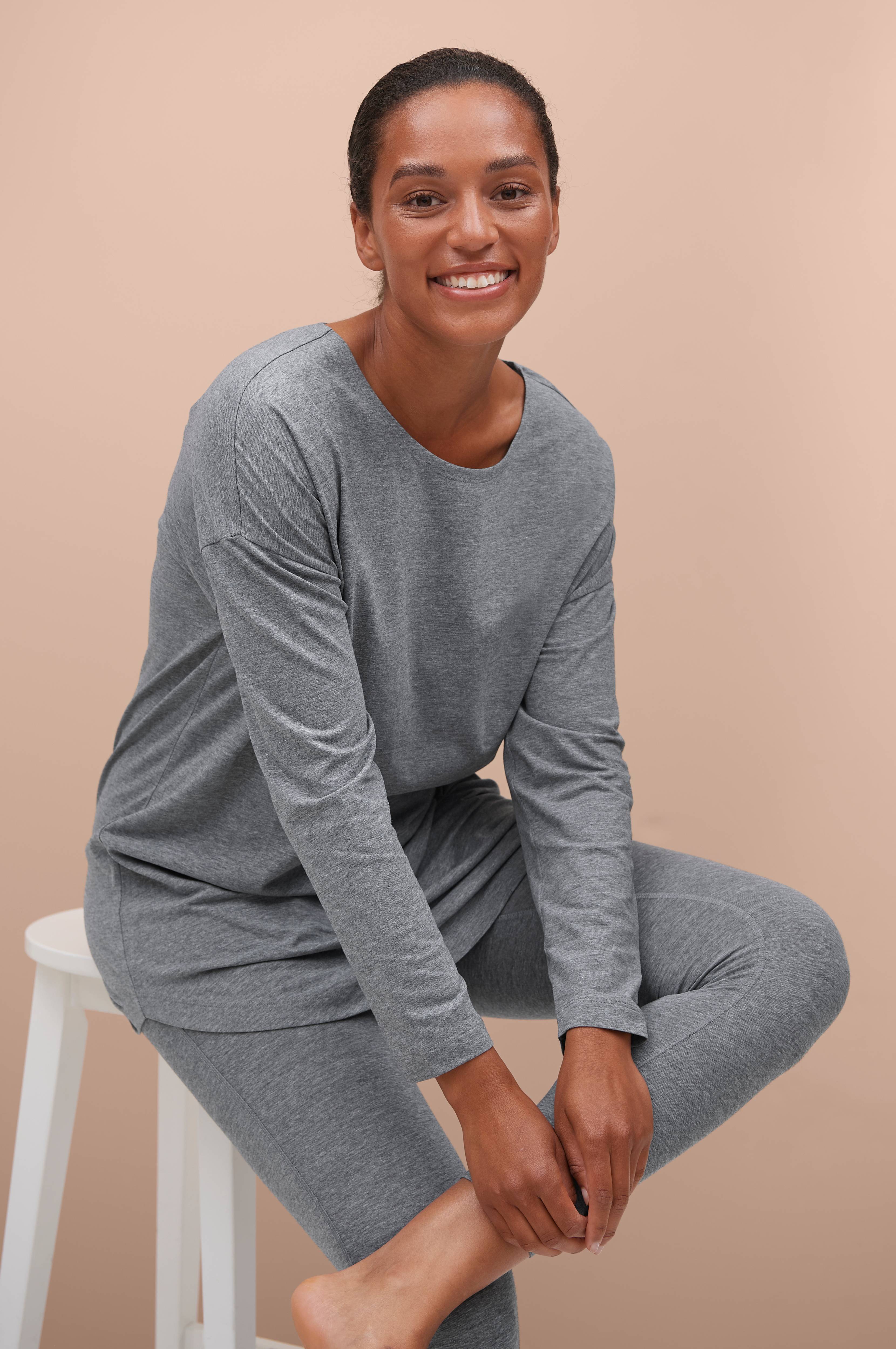 Top i lige model af blød jersey med langt ærme og rund hals samt afrundet kant forneden. Længde ca. 80 cm i str. S.