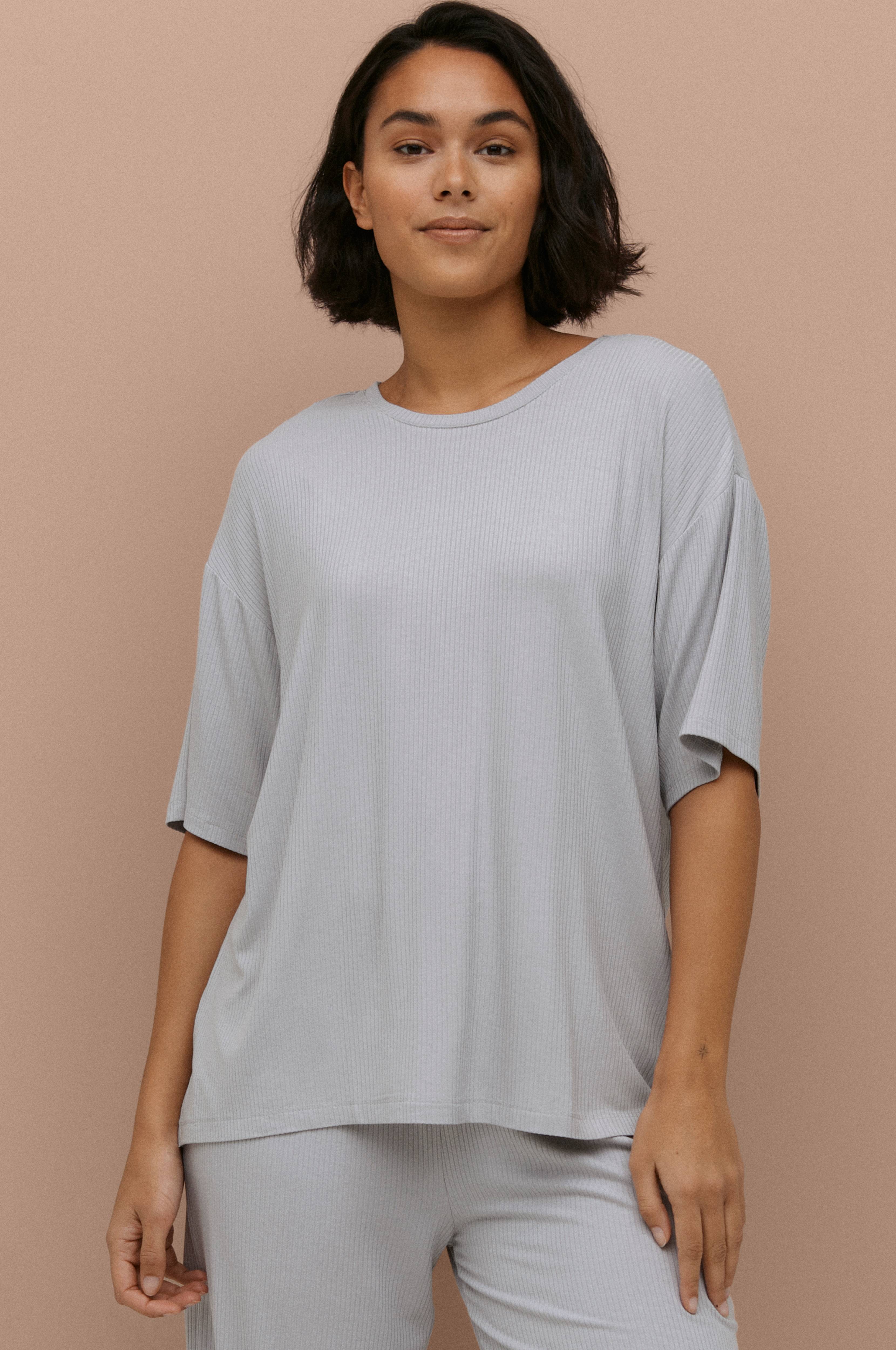 Top med løs pasform i blød og skøn jerseyrib af viskose. Lave skuldre og sideslids forneden. Længde bagpå ca. 66 cm i str. 38/40.
