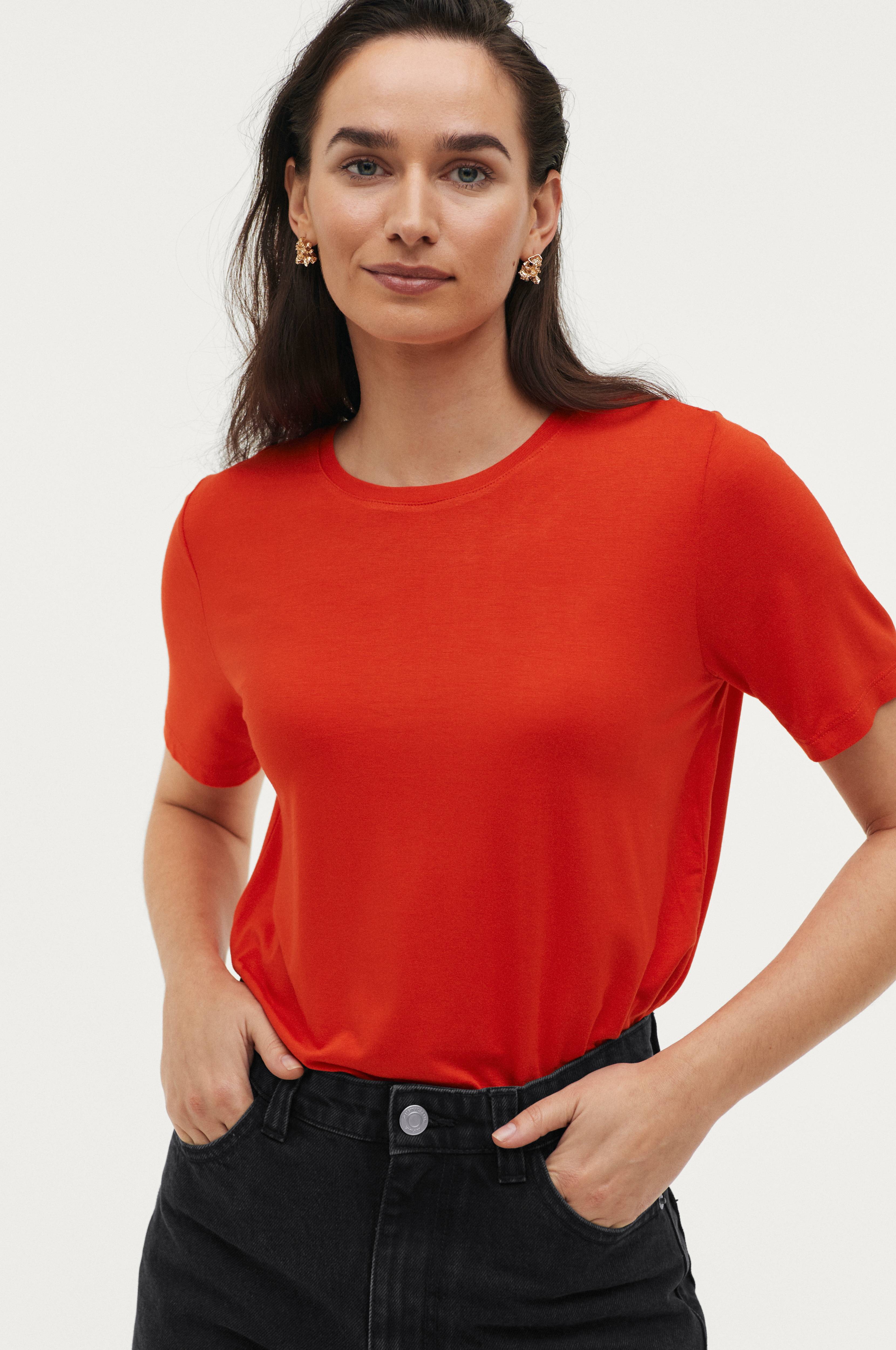 Vidunderlig t-shirt i viskose. Behageligt materiale, flot pasform og fald. Normal i størrelse. Ændrer sig ikke efter vask. Håber disse kommer i flere farver. Har købt marineblå og s…