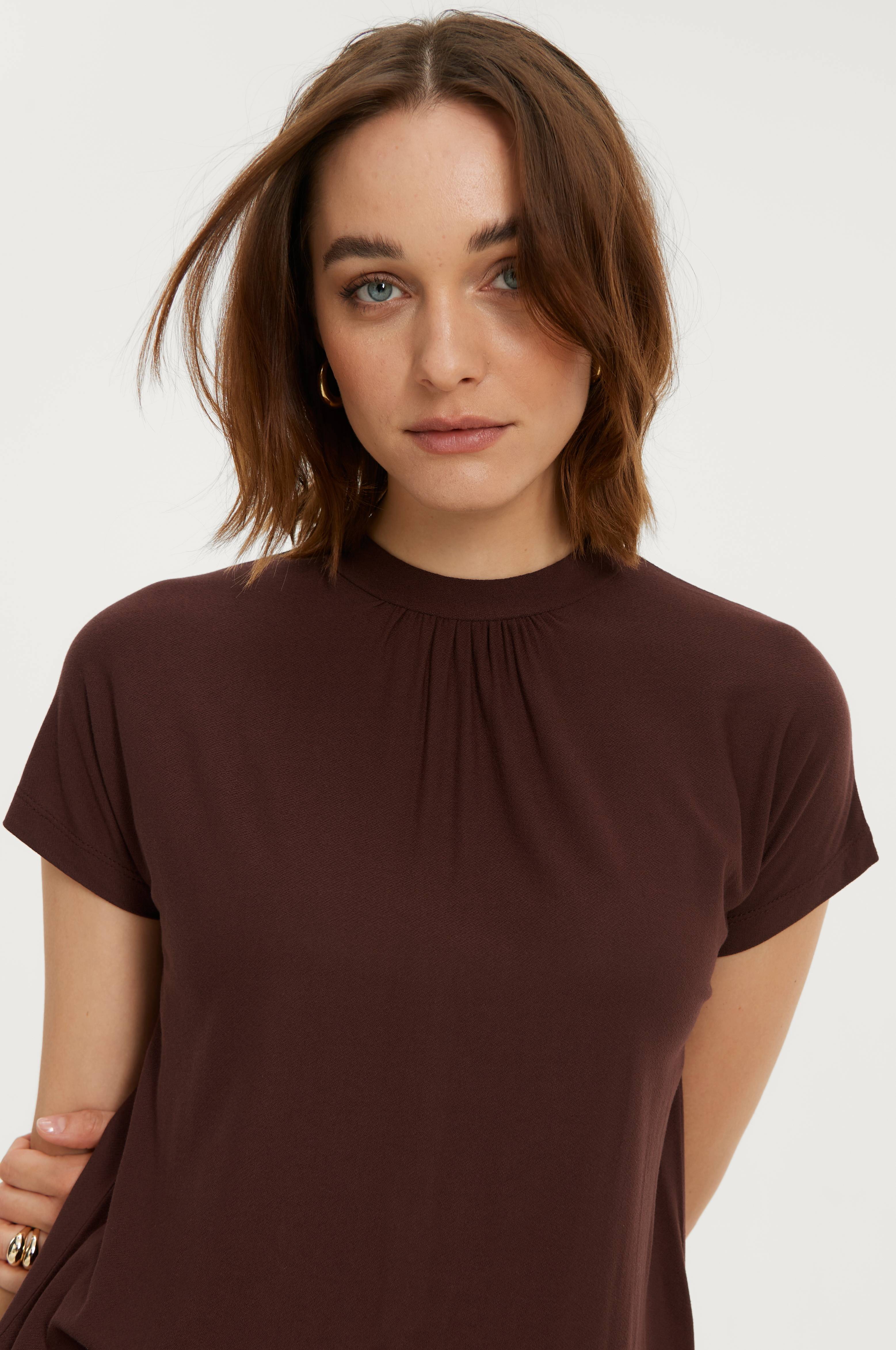 Top i tynd, blød viskosejersey. Kortærmet model med høj hals med rynkning foran og slids og indvendige knapper i nakken. Længde ca. 69 cm i str. 34/36.