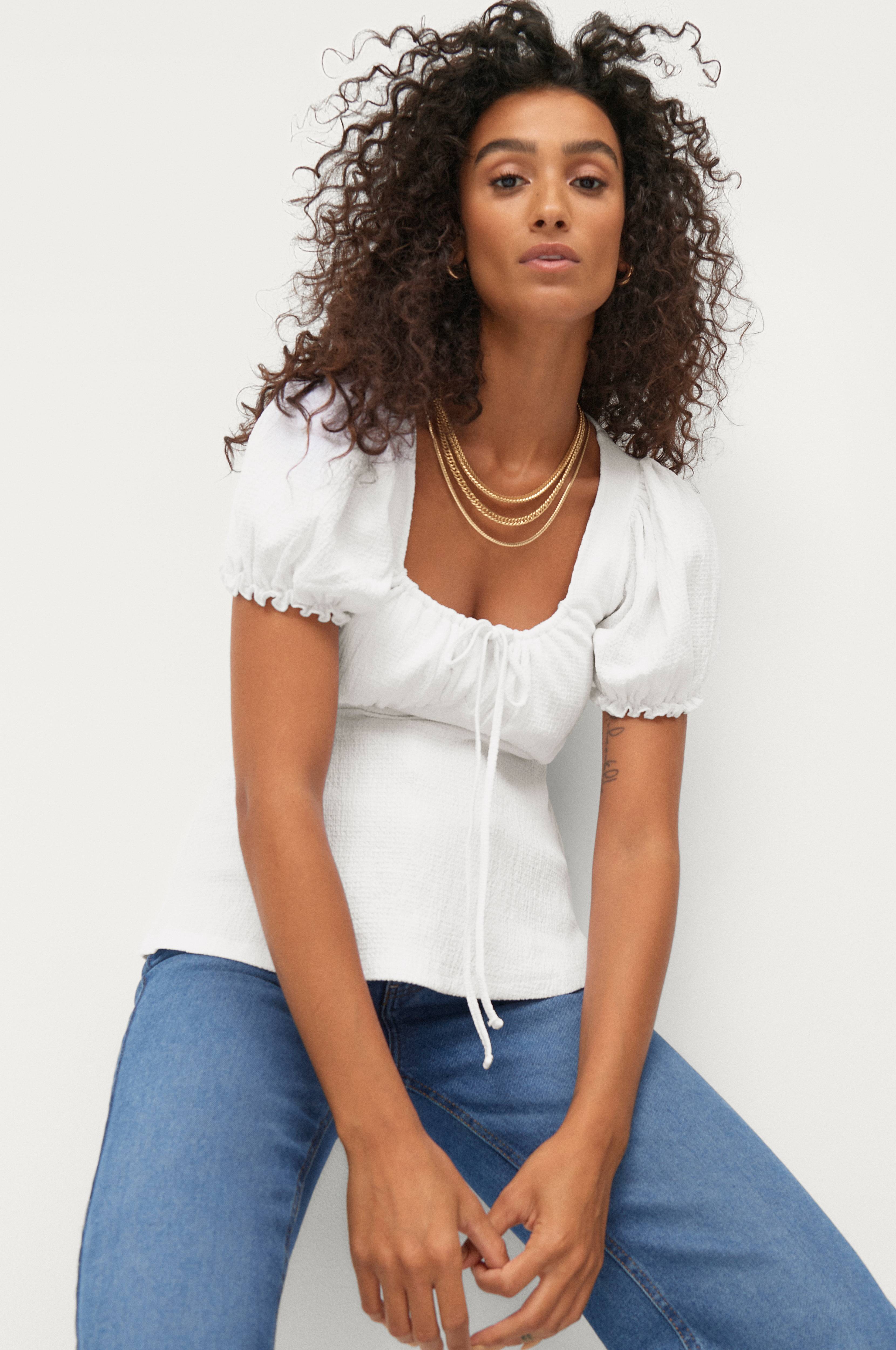• Dyb udskæring med træksnørre• Samling ved brystet• Korte ballonærmer med elastiske manchetter med volant• Behandlet strækkvalitet• Længde: 59 cm i størrelse 34/36