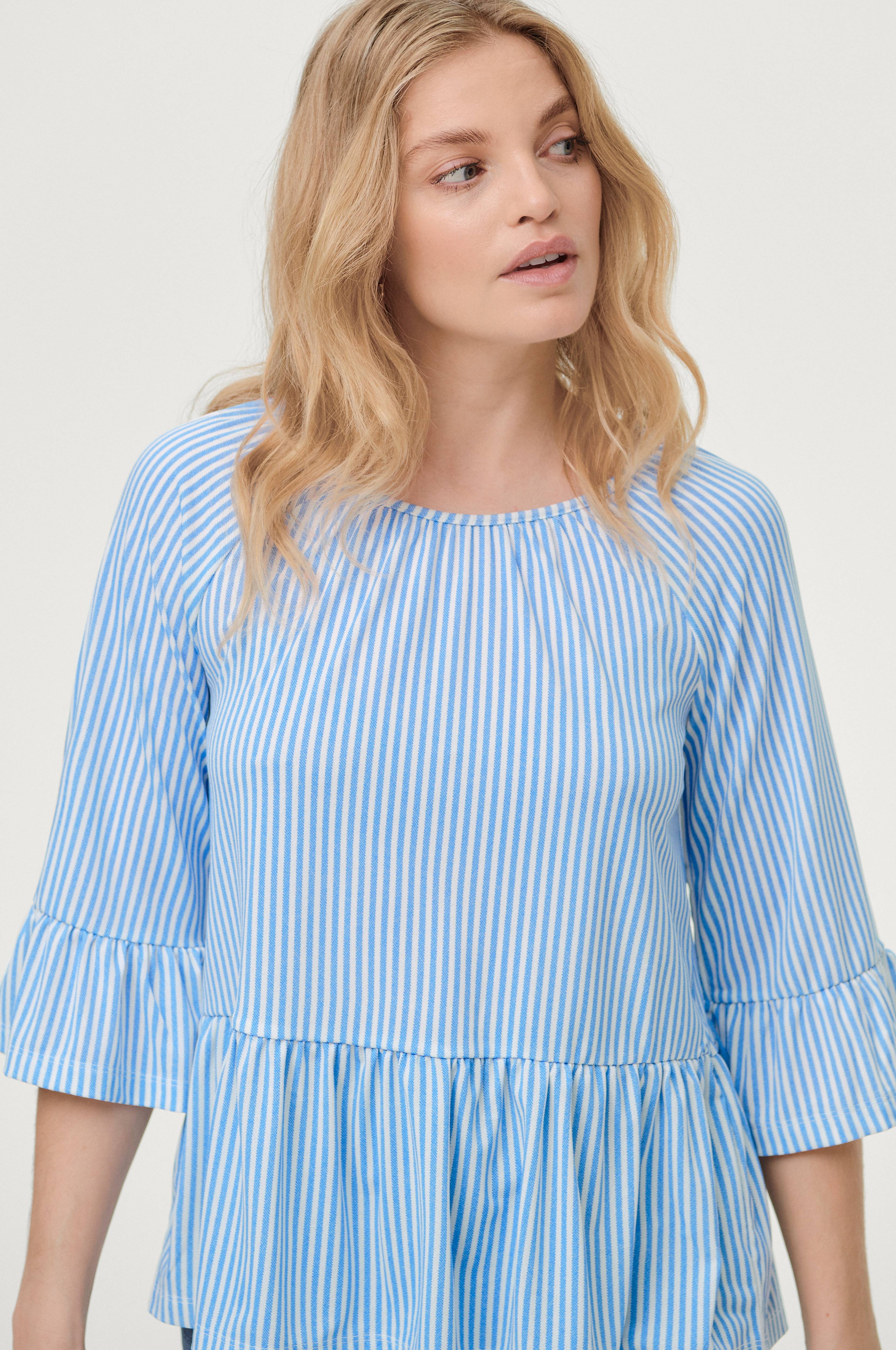 Top i stretchjersey med printet mønster. Rund, elastisk halsudskæring. Ærme i 3/4-længde med tynd elastik og flæse i ærmekant. Elastisk afskæring med flæse i kanten forneden. Længde ca. 62 cm i str. 34/36.