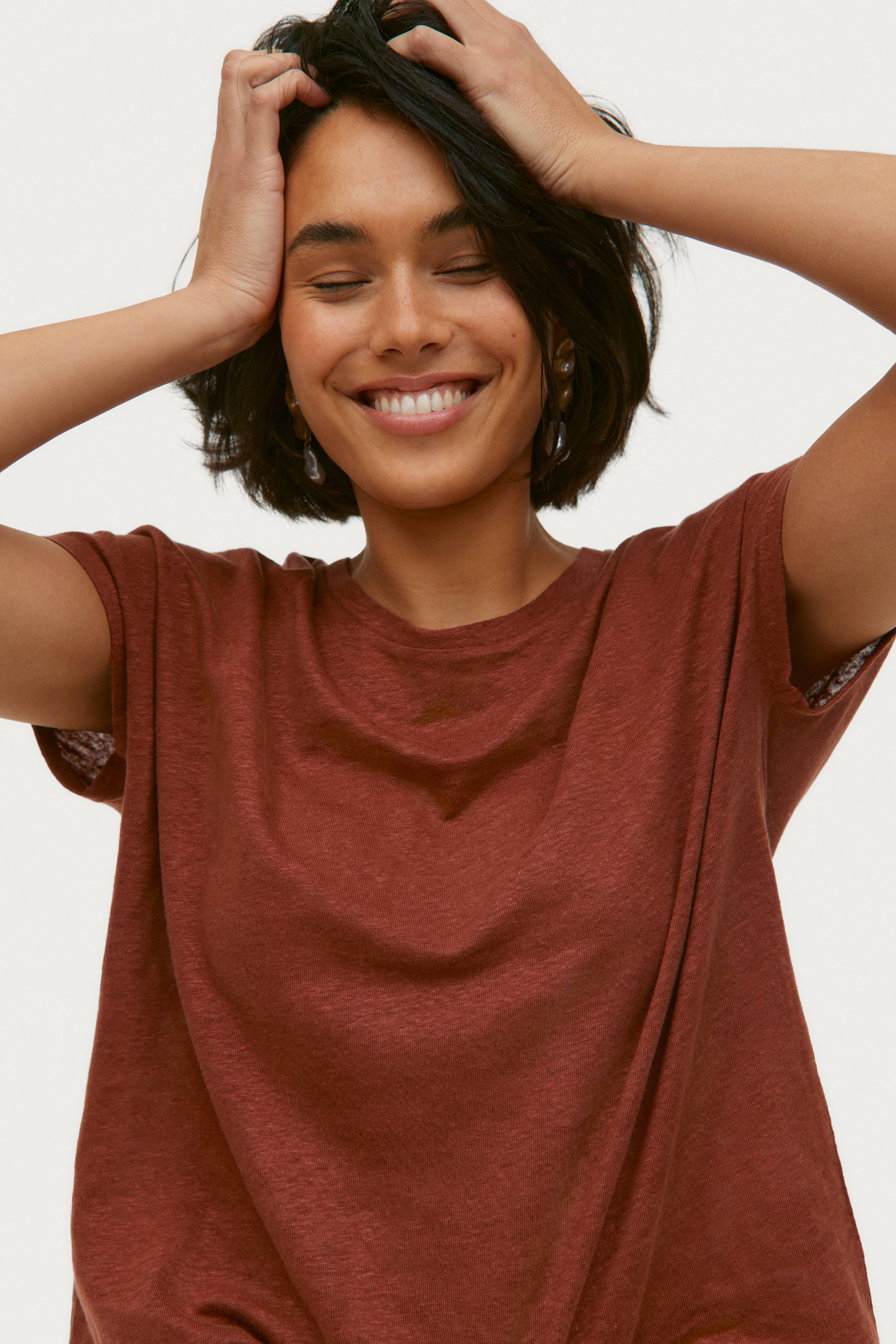 Top i hørjersey med korte ærmer og rund hals med ribkant. Løs pasform. Længde ca. 60 cm i str. 34/36.
