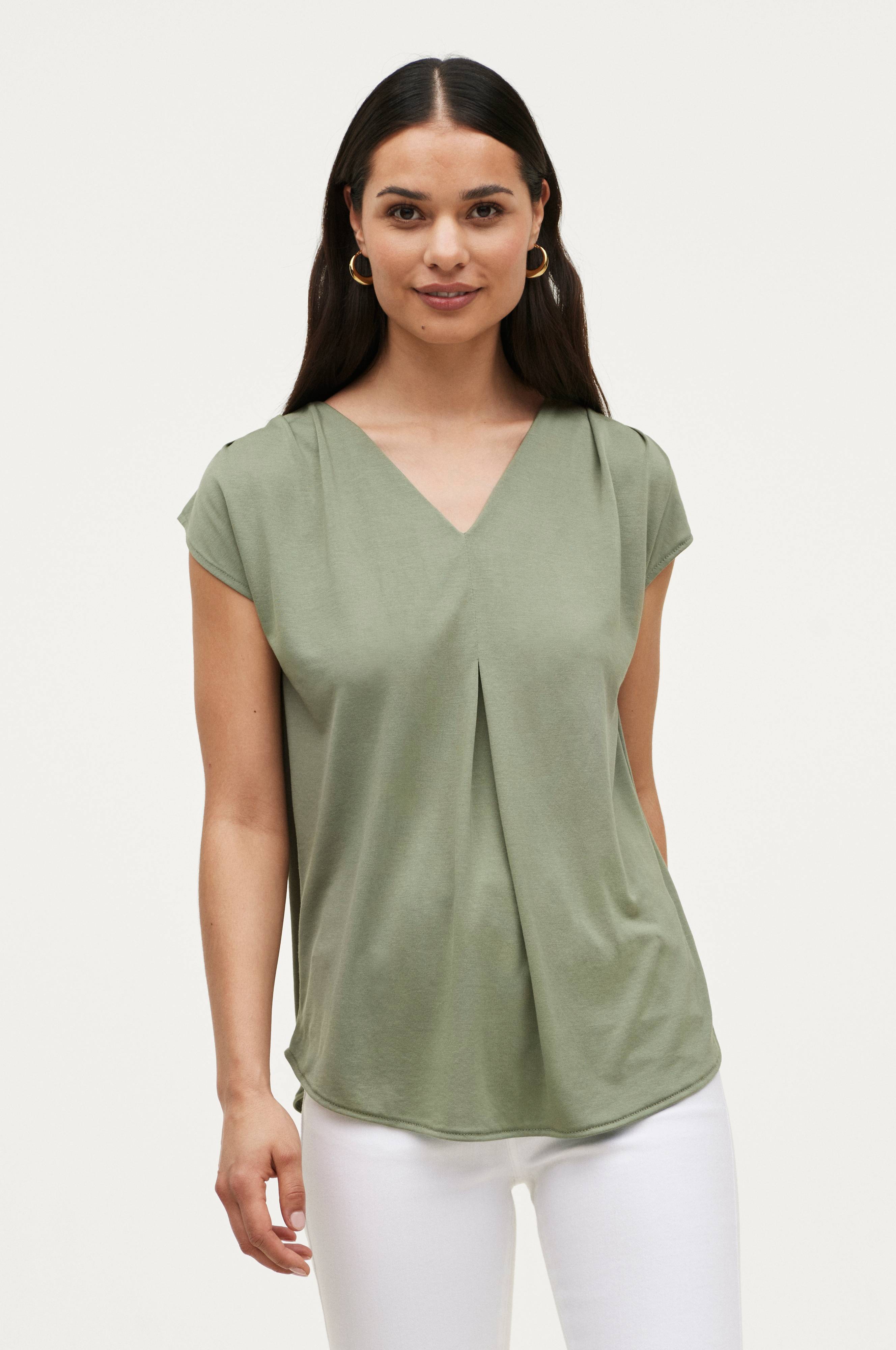 Top Tandy i kortærmet model med v-udskæring og lagt læg foran som giver et flot fald. Dekorative, lagte læg på skuldrene samt afrundede sider forneden. Længde ca. 70 cm i str. 34/36.