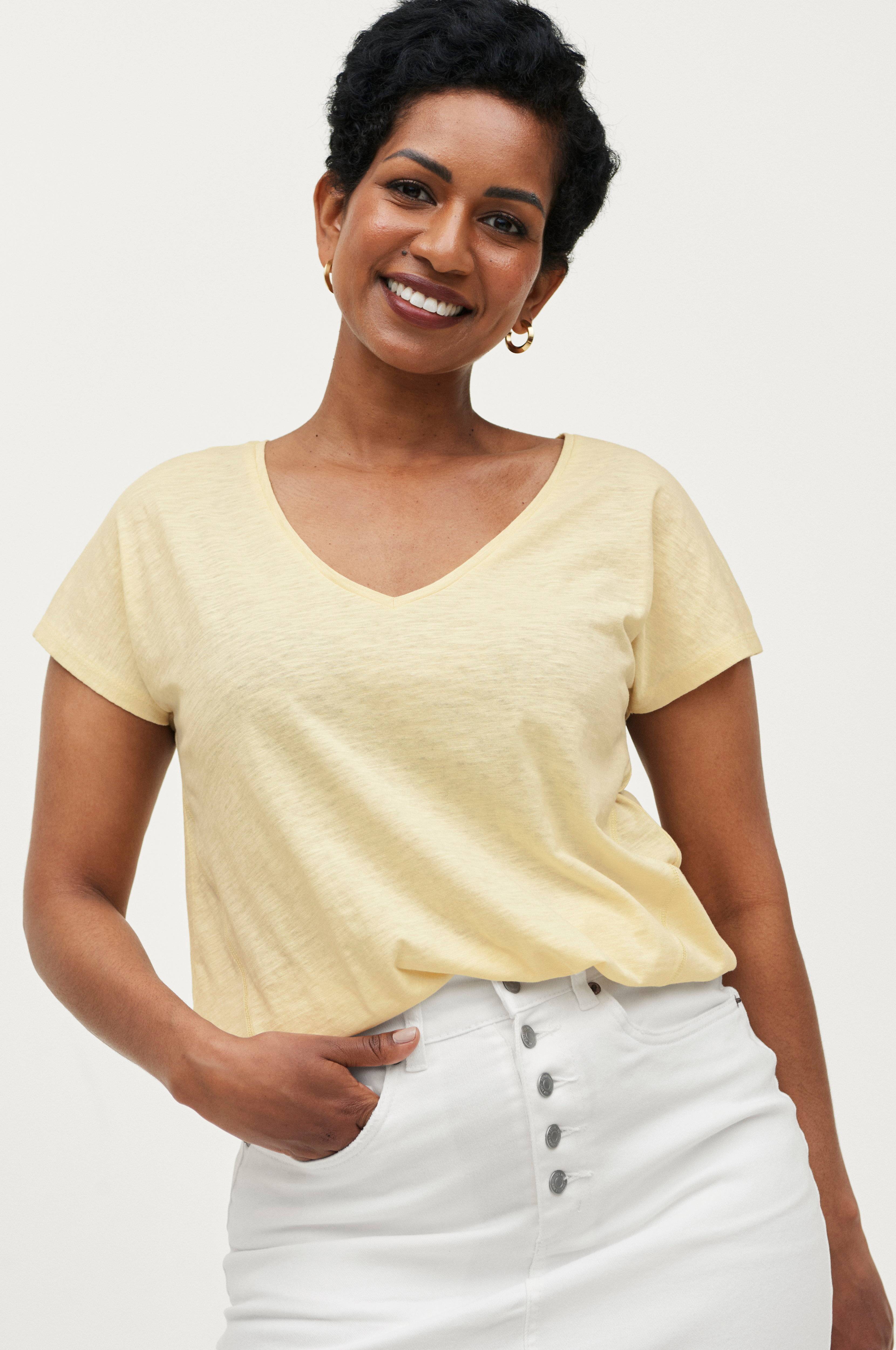 Top i lige model af slubjersey med pyntestukne, diagonale sømme foran. Lav skulder og V-formet halsudskæring med lille ribkant. Længde ca. 66 cm i str. 34/36.