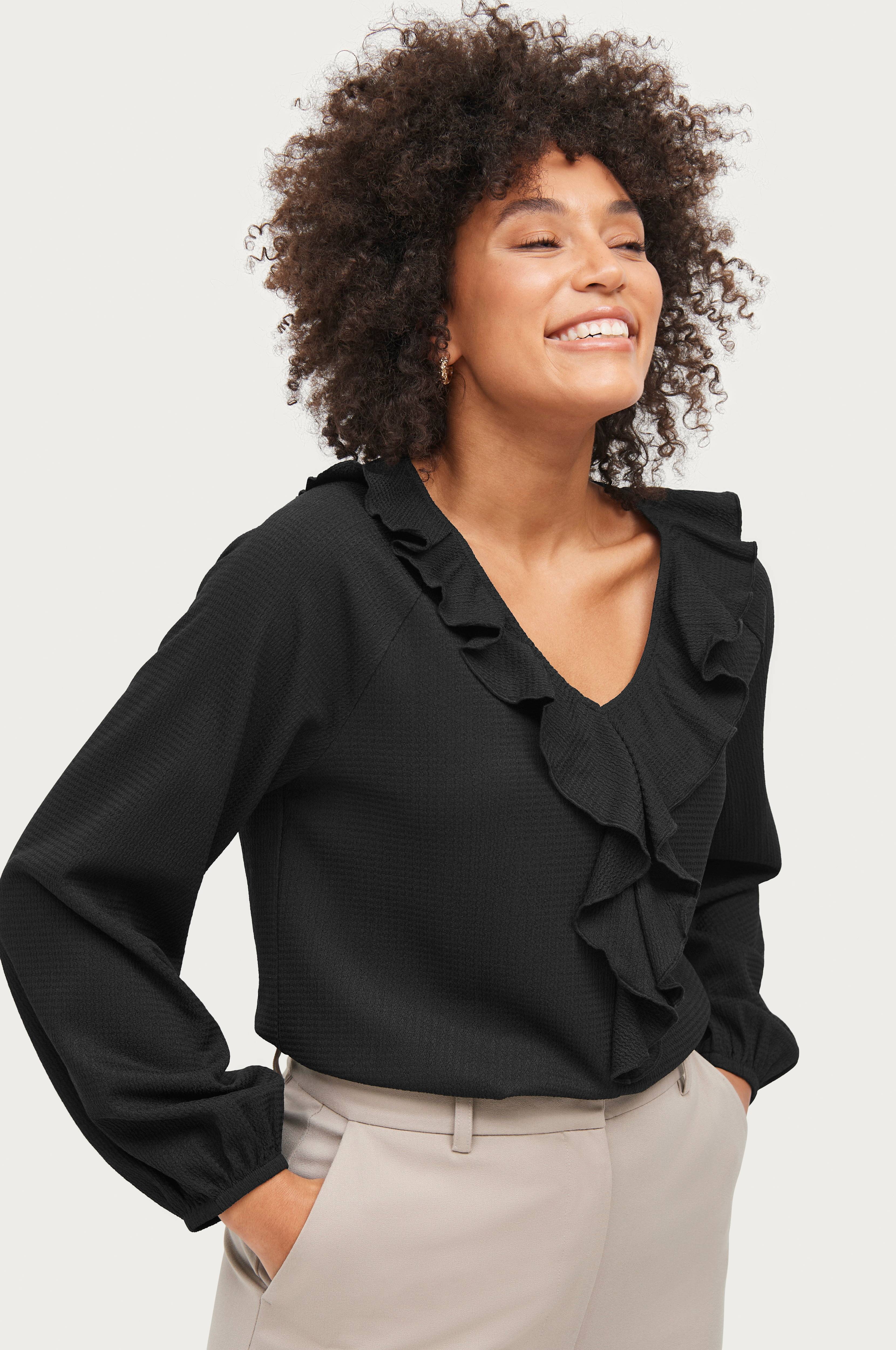 • V-udskæring med volant • Noget bredere ærmer med elastiske manchetter • Mønstervævet materiale • Længde: 64 cm i størrelse 34/36 • Produktet indeholder genindvundet materiale, som genbruges for at reducere mængden af affald samtidigt med at der ikke anvendes nye ressourcer.