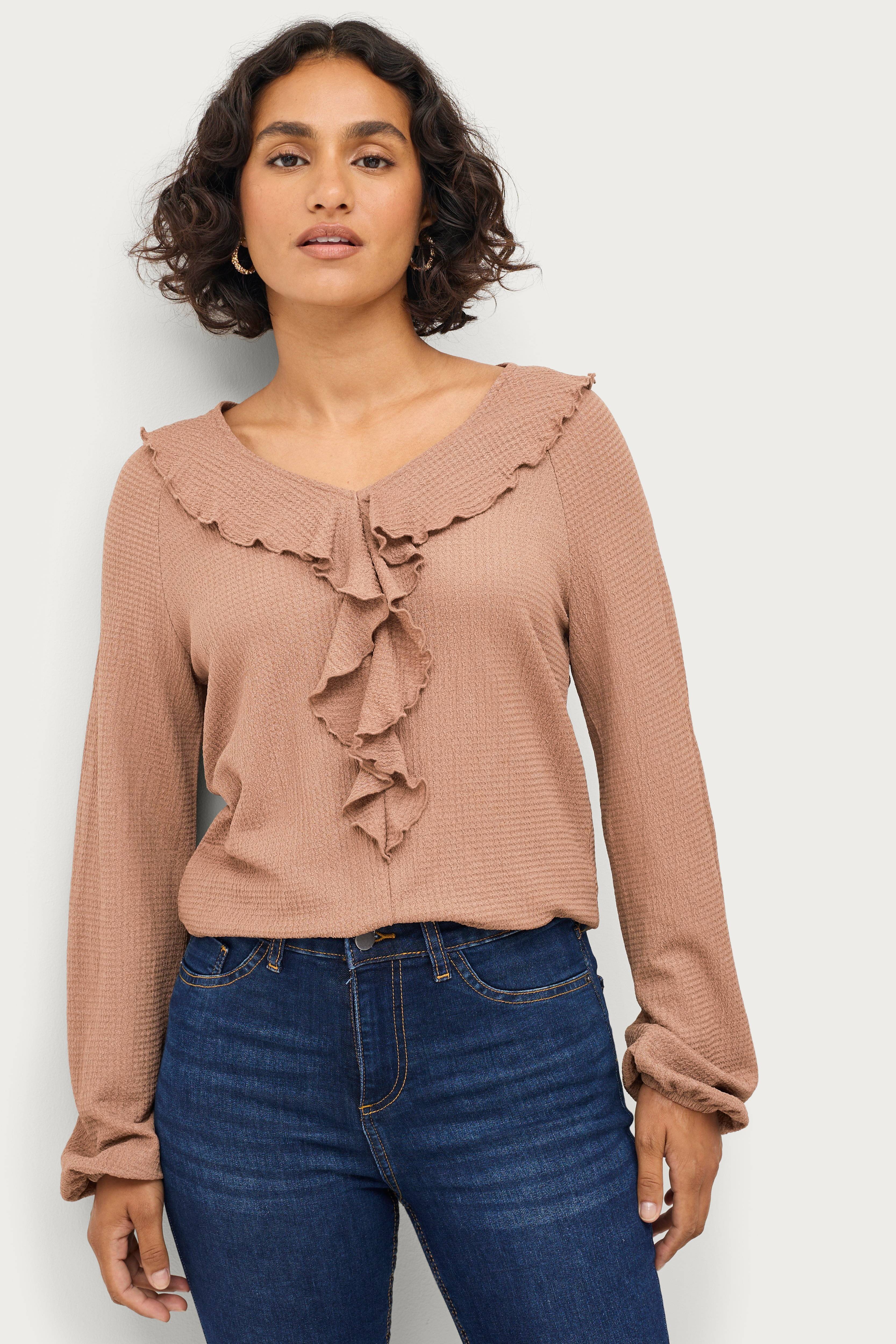 Kan lide stoffet, som er lidt vaffelmønstret med en smule stretch i. Pasform og størrelse er rigtig til mig, som er kort og buttet over mave/hofte.