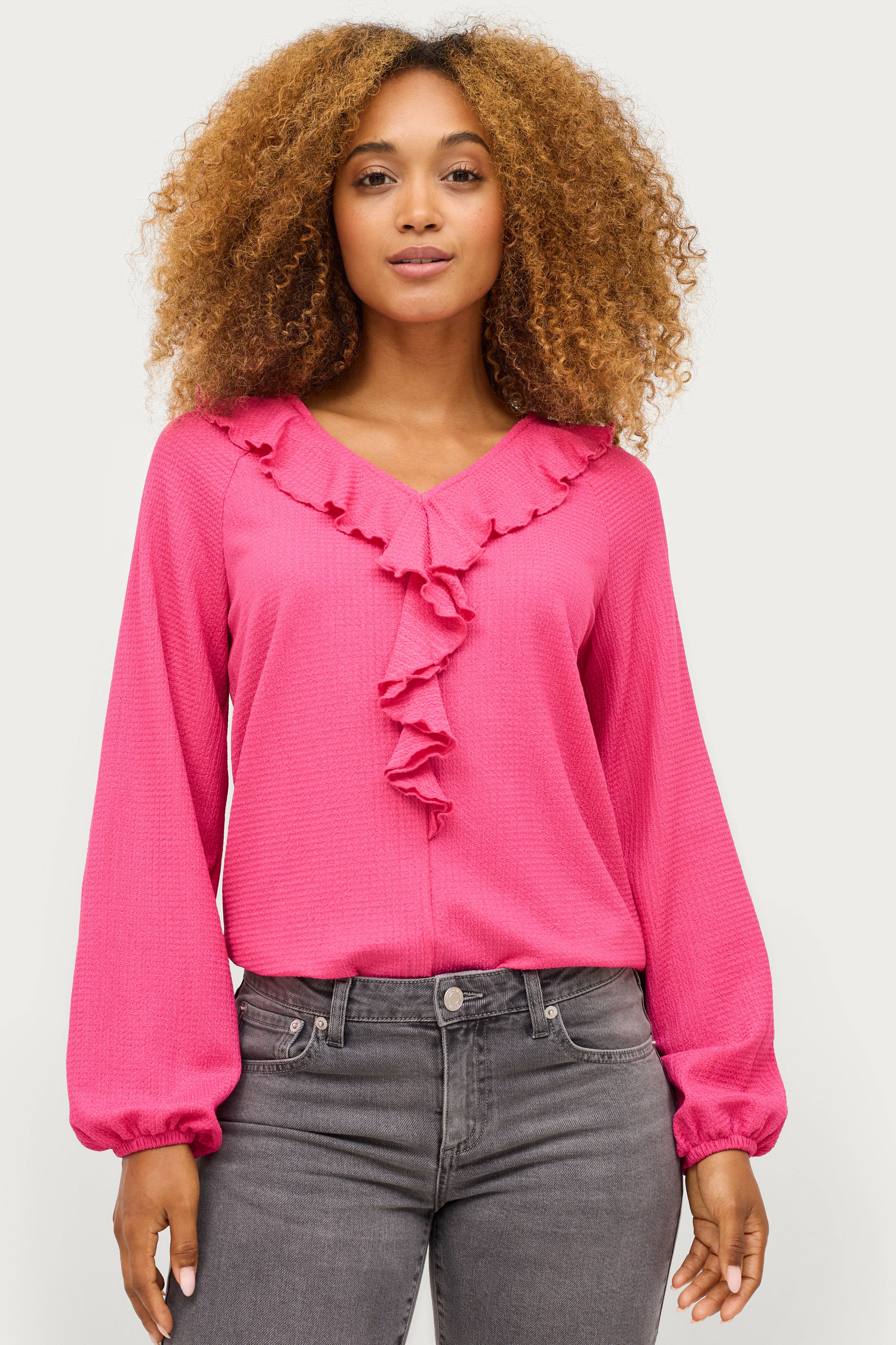 • V-udskæring med volant • Noget bredere ærmer med elastiske manchetter • Mønstervævet materiale • Længde: 64 cm i størrelse 34/36 • Produktet indeholder genindvundet materiale, som genbruges for at reducere mængden af affald samtidigt med at der ikke anvendes nye ressourcer.