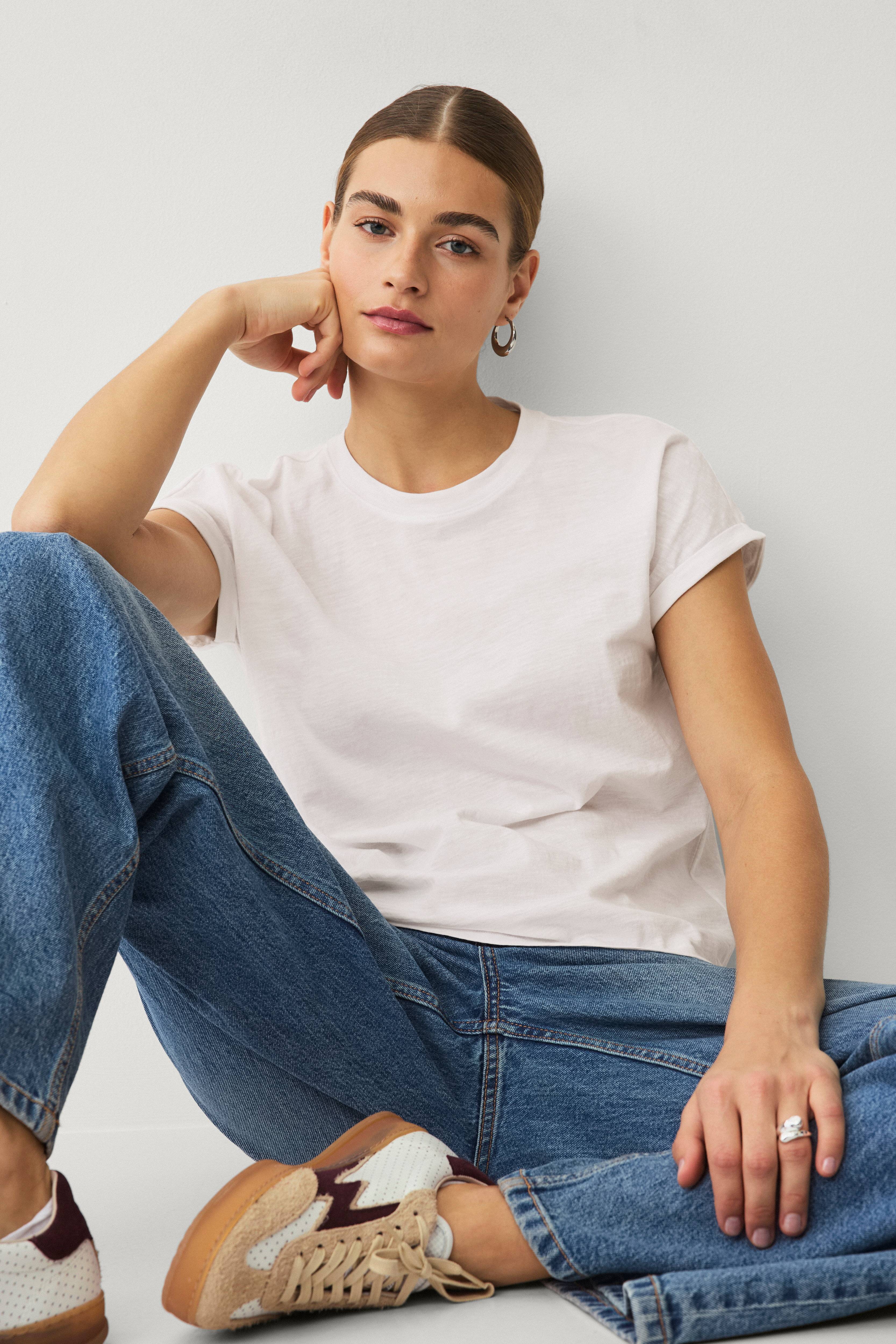 • Nedsænket skulder med kort ærme og fæstet oprullet