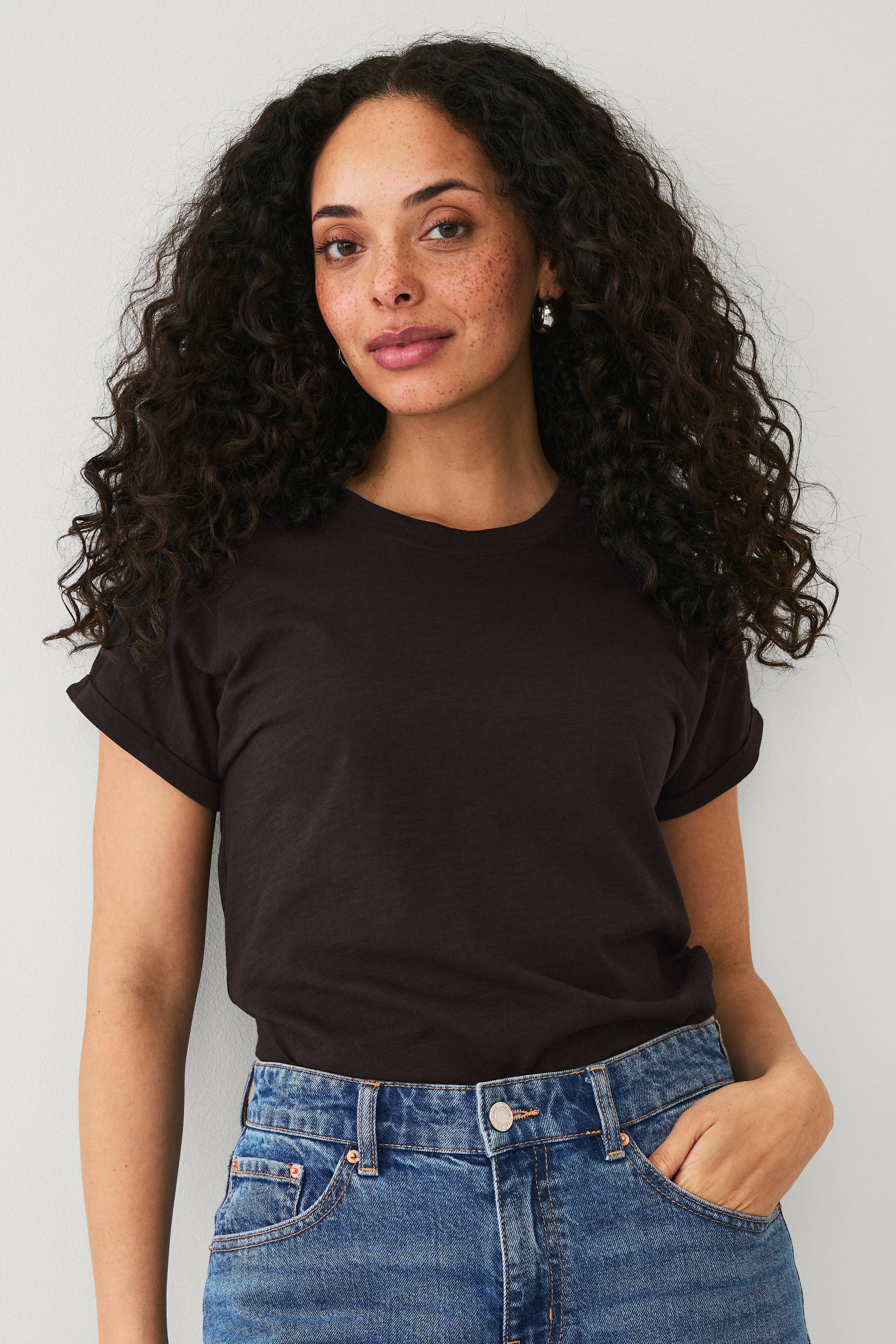 • Nedsænket skulder med kort ærme og fæstet oprullet
