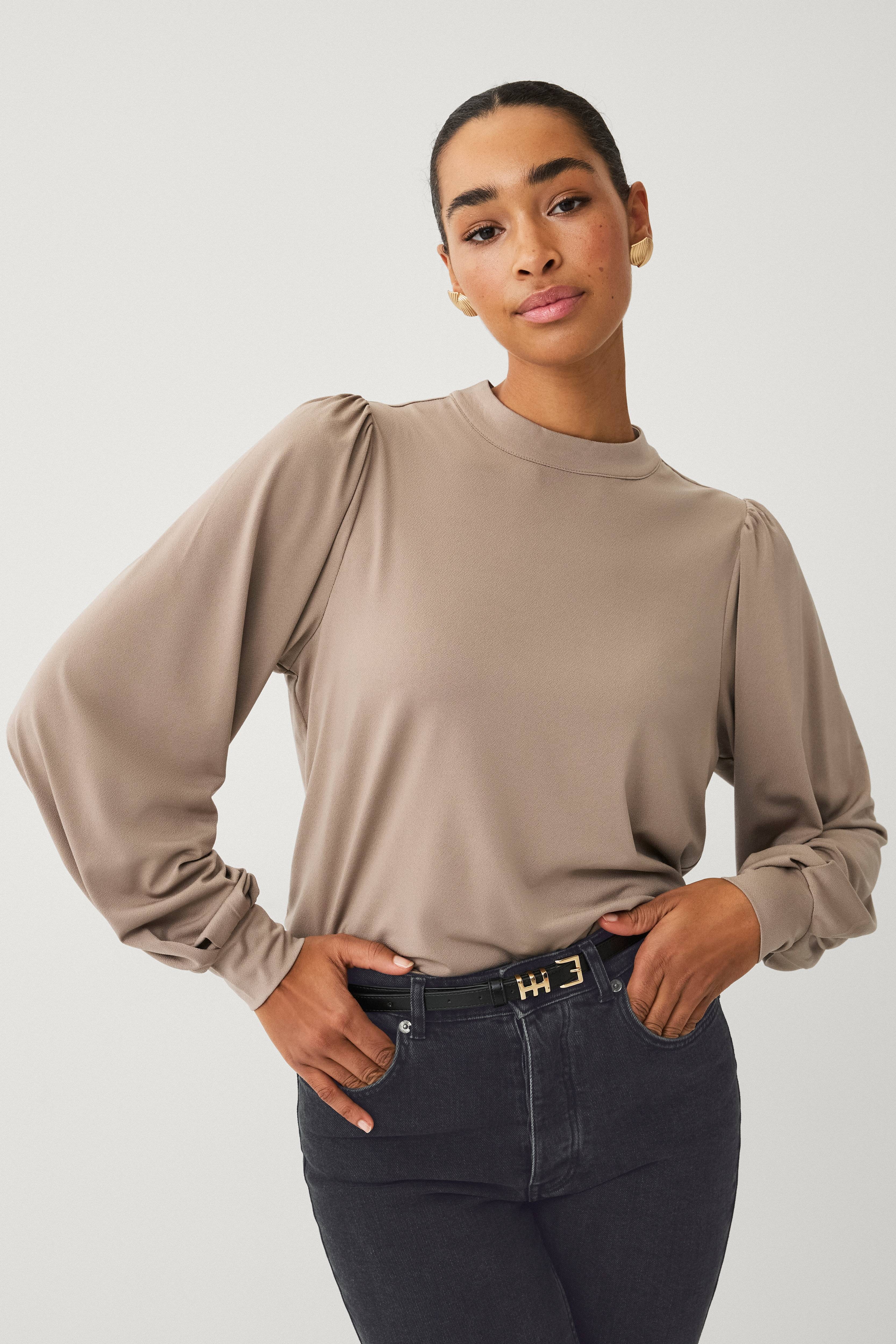 • Lige, elastisk model• Halvhøj kant i halsen med knapper i nakken• Langt, bredt ballonærme med manchet ved manchetterne• Længde: 58 cm i størrelse S