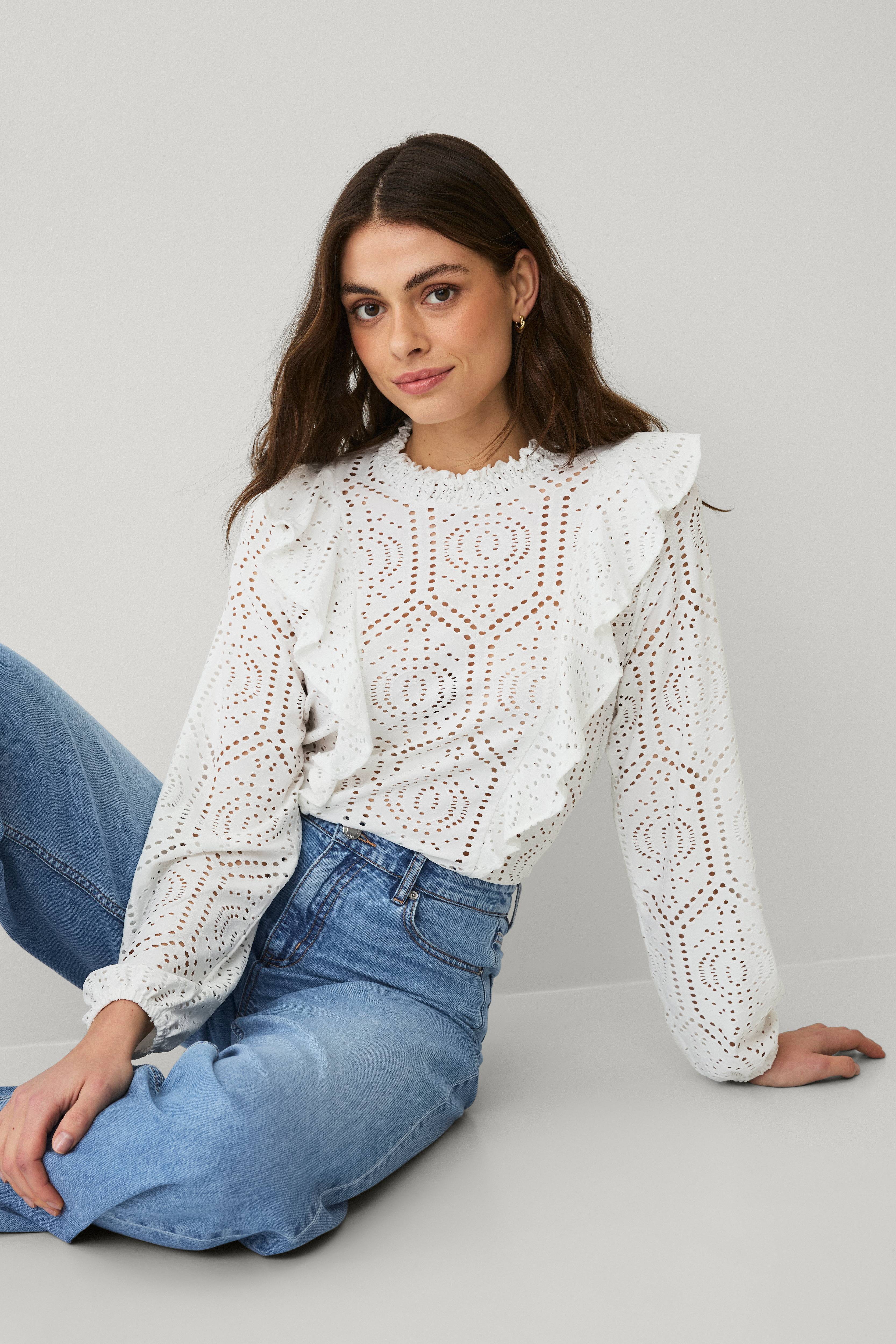 • Top i semitransparent polyestermix med hulmønster• Rund halsudskæring med smocket, noget højere kant• Volanter langs forsiden og langs ryggen• Lange arme med elastik ved manchetterne• Længde: 58 cm i størrelse S