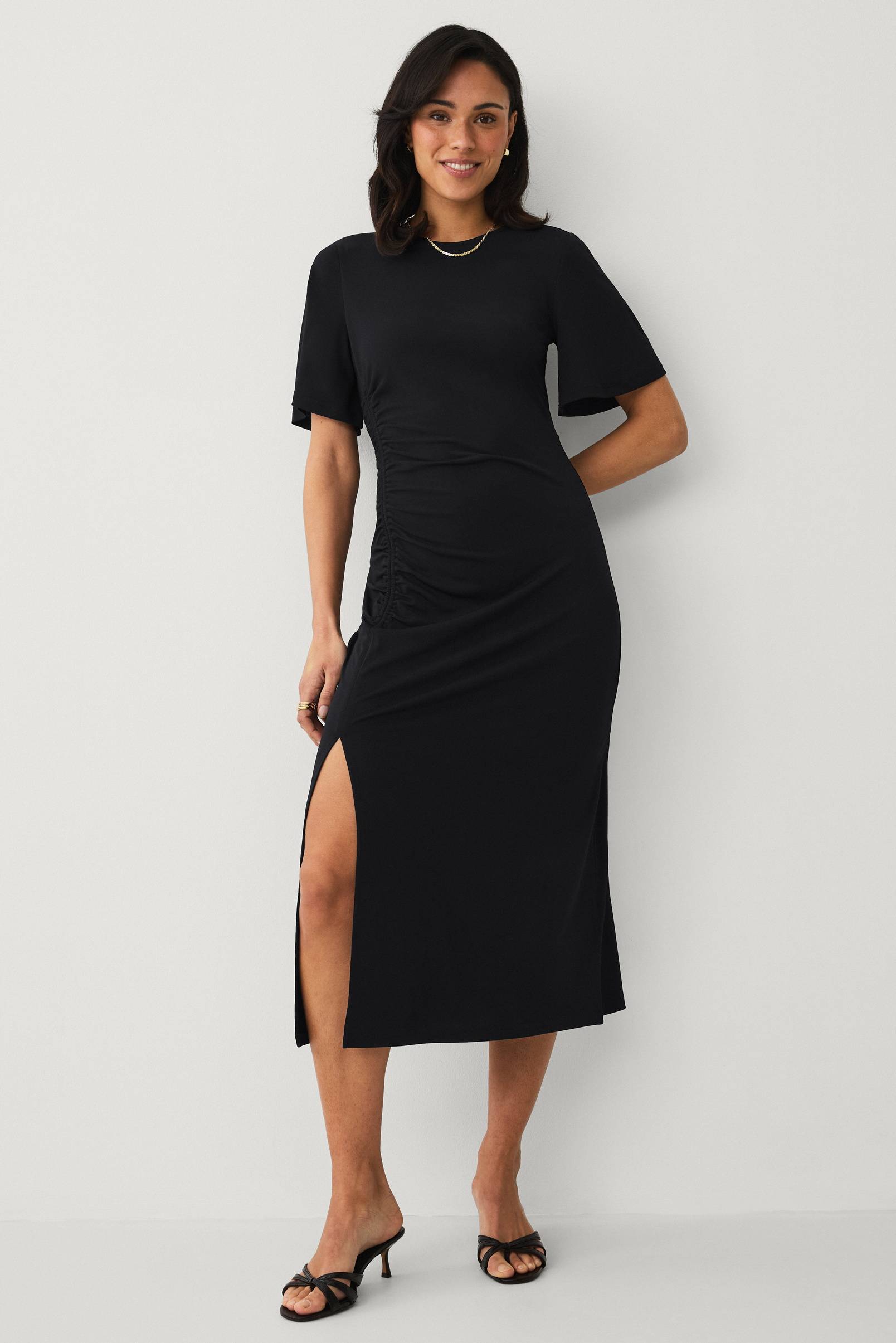 • Elastisk kjole• Rund halsudskæring• Korte sommerfugleærmer• Rynket drapering i den ene side• Slids nederst i den ene side• Normal pasform• Længde: 126 cm i størrelse S