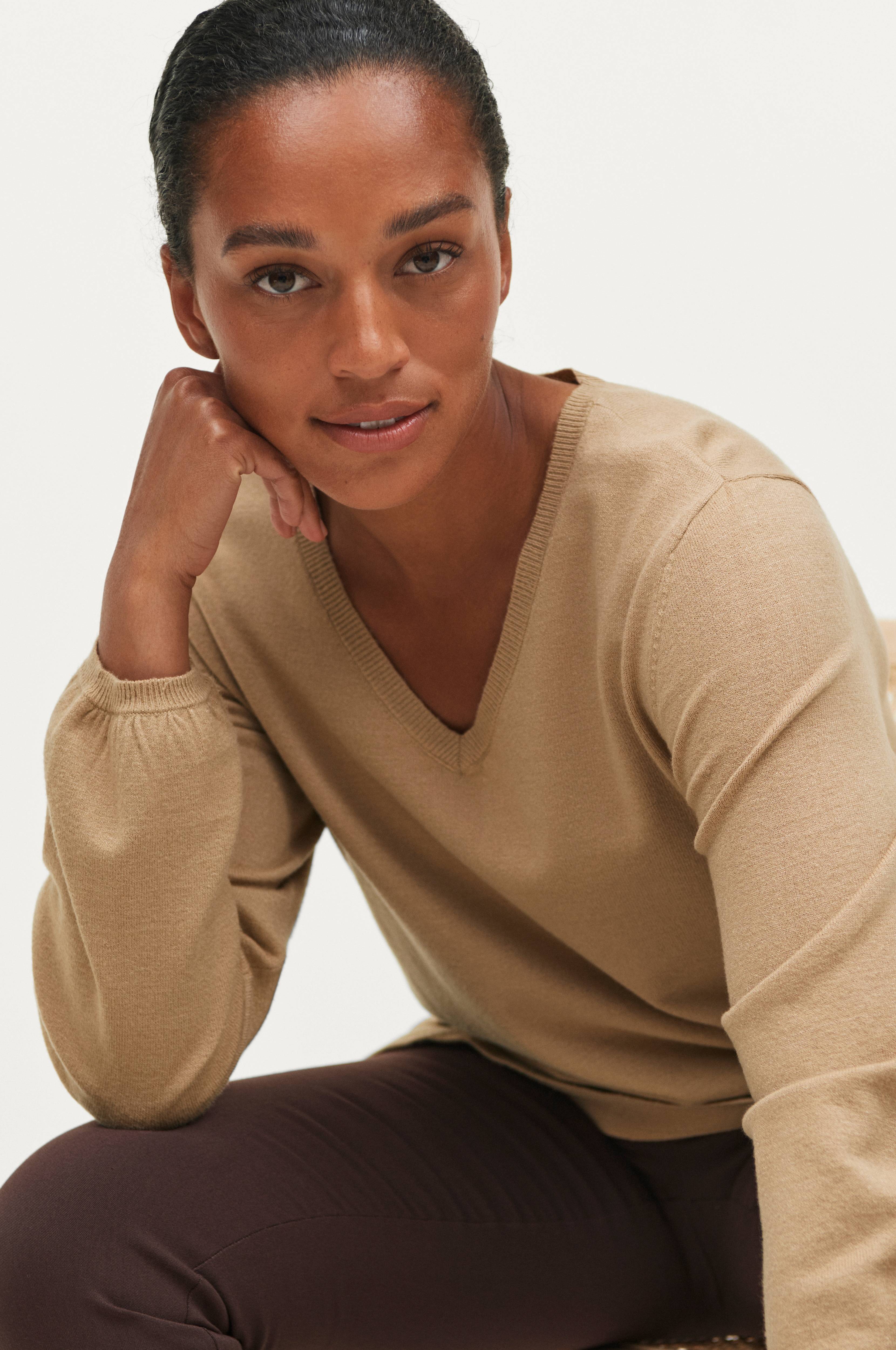 Trøje Ada i blød, strikket viskoseblanding. Lige, noget længere model med V-udskæring med rib og sideslids forneden. Længde ca. 72 cm i str. 34/36.