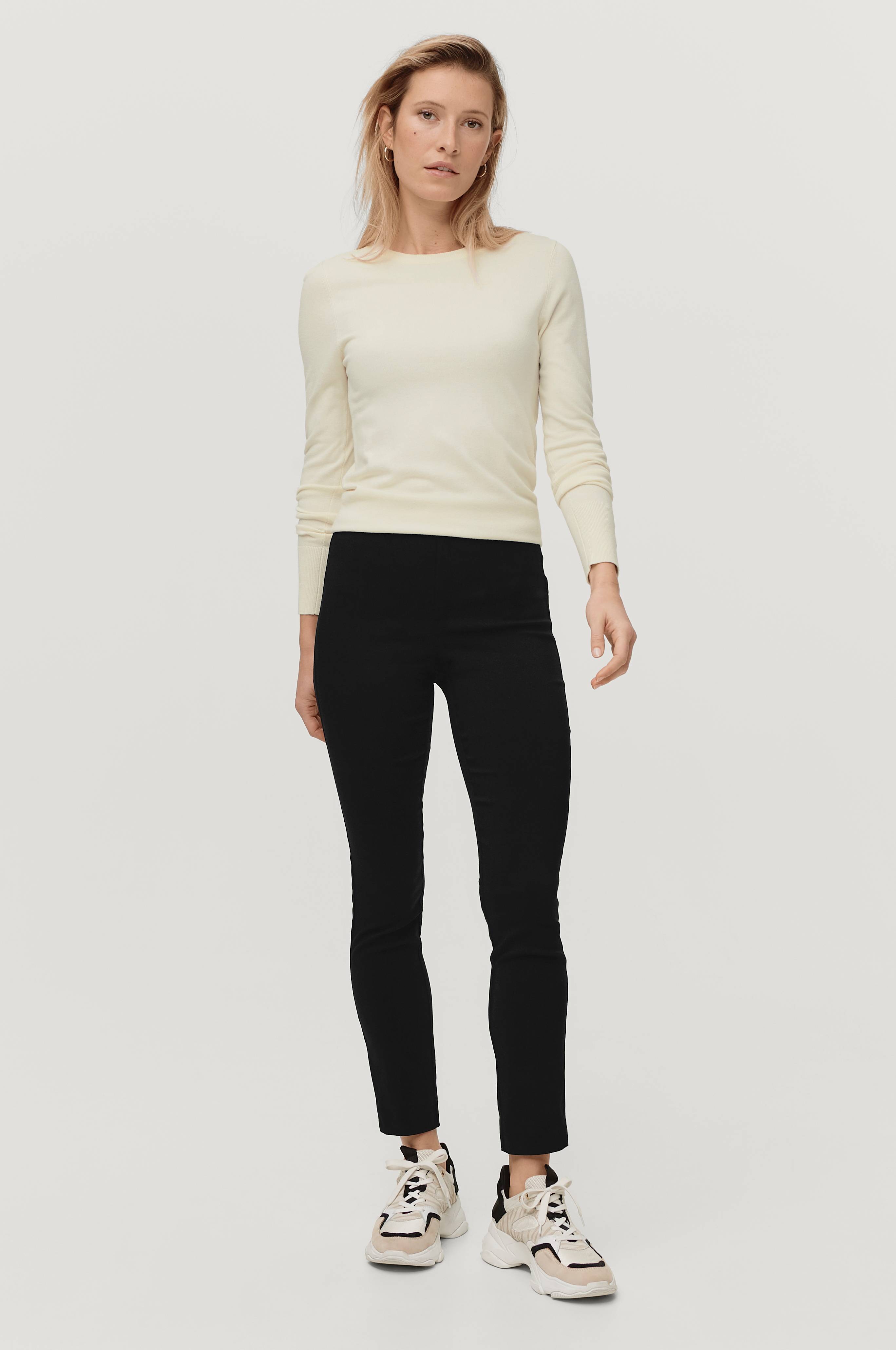 Trøje Celia i stilfuld, finstrikket model med rund halsudskæring. Bred ribstrik med pynteknapper i metal i ærmekant. Ribkanter i hals og kant forneden. Længde ca. 63 cm i str. 34/36.
