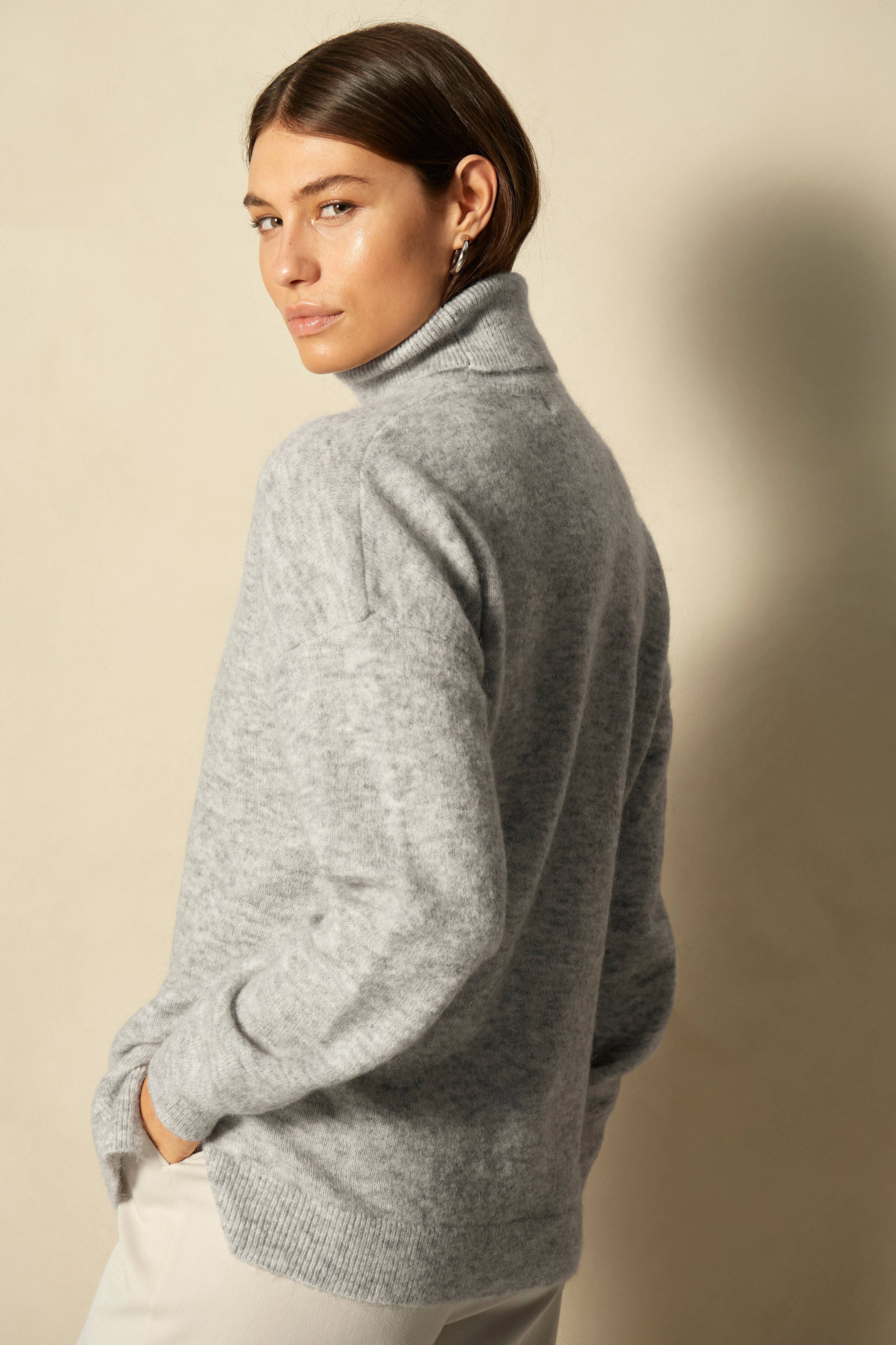 Striktrøje i blødt materiale med uld og mohair. Ribstrikket rullekrave og lave skuldre. Ribkant i ærmekant og forneden. Længde ca. xx cm i str. 34/36.