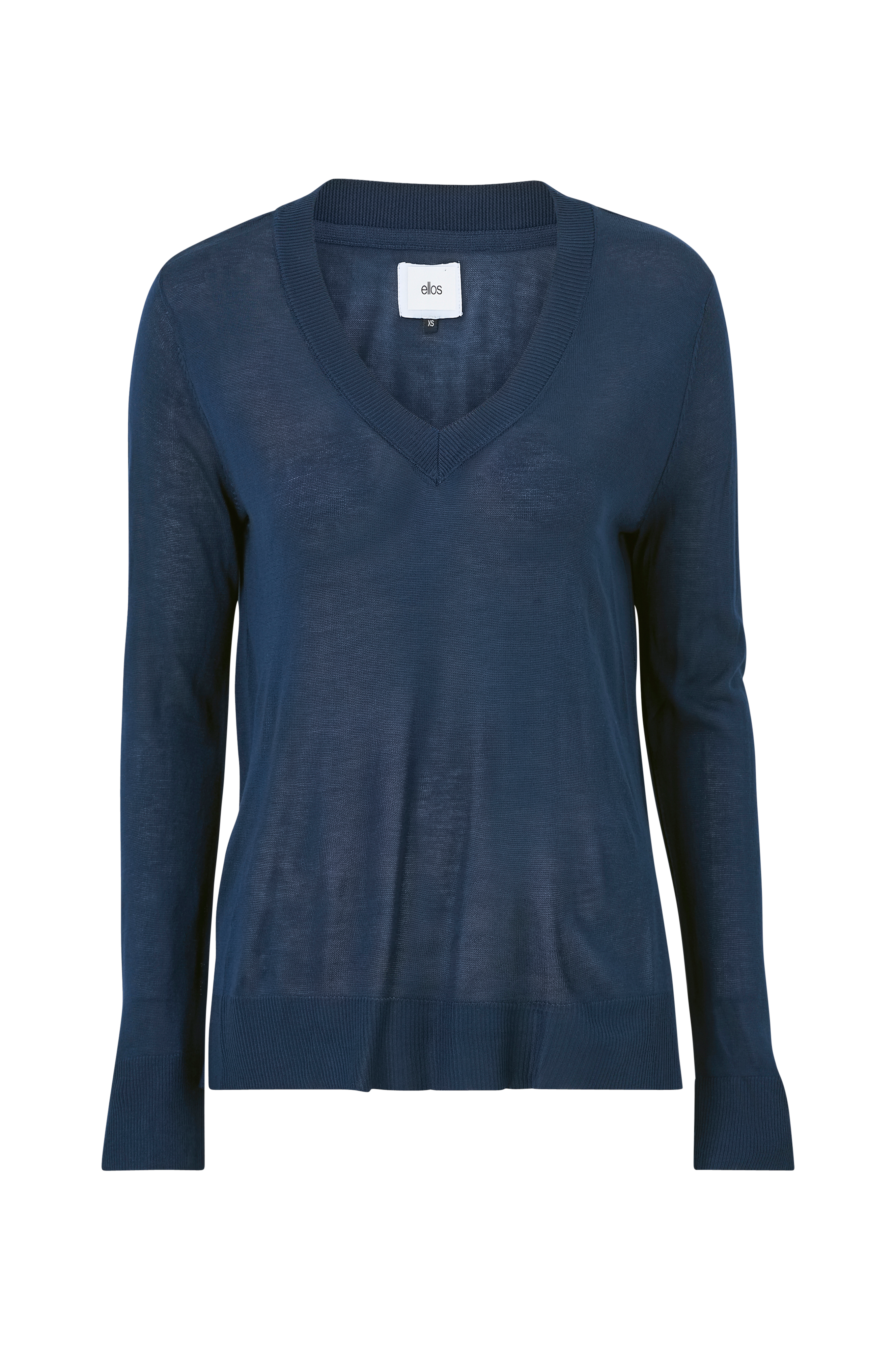 Finstrikket trøje Frida V i blød, tynd og semitransparent kvalitet. V-formet halsudskæring med ribkant. Rib i ærmekant og forneden. Noget længere bagpå.